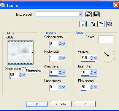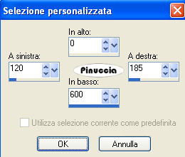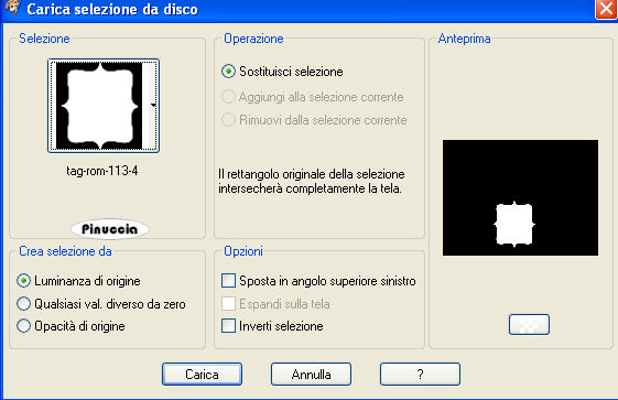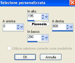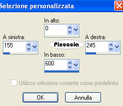 qui puoi trovare qualche risposta ai tuoi dubbi. Se l'argomento che ti interessa non è presente, ti prego di segnalarmelo. Questo tutorial è stato scritto con PSP Corel X2, ma può essere eseguito anche con le precedenti versioni. Per tradurlo, ho usato PSP X. Occorrente: Un tube a scelta. Il resto del materiale qui Il tubes usato per il mio esempio è di Lory Rhae. Filtri: Xero - Porcelain qui Metti la trama nella cartella Trame. Metti le selezioni nella cartella Selezioni. 1. Apri una nuova immagine trasparente 800 x 600 pixels. Scegli tre colori dai tuoi tubes. Per il mio esempio ho impostato il colore di primo piano con il colore chiaro #DDE2F1, e il colore di sfondo con il colore scuro #B50710. Il terzo colore #E2A76D. Dovrai usare anche il nero. Non dimenticare di controllare sempre che sia impostato il colore richiesto. 2. Riempi l'immagine trasparente con il colore chiaro di primo piano.Effetti>Effetti di trama>Trama - seleziona la trama hg002, con i seguenti settaggi: ![]() 3. Livelli>Nuovo livello raster. Attiva lo strumento Selezione ![]() clicca sull'icona Selezione personalizzata ![]() e imposta i seguenti settaggi: ![]() Riempi la selezione con il terzo colore #E2A76D.Effetti>Effetti di trama>Trama, come al punto 2. Selezione>Deseleziona. 4. Effetti>Effetti 3D>Sfalsa ombra, con i seguenti settaggi: ![]() 5. Livelli>Nuovo livello raster. Selezione>Carica/Salva selezione>Carica selezione da disco. Cerca e carica la selezione "tag-rom-113-1": ![]() Riempi con il colore scuro di sfondo.Selezione>Deseleziona. Effetti>Effetti 3D>sfalsa ombra, come al punto 4. 6. Livelli>Nuovo livello raster. Selezione>Carica/Salva selezione>Carica selezione da disco. Cerca e carica la selezione "tag-rom-113-2": ![]() Riempi con il colore nero #000000.Selezione>Deseleziona. Effetti>Effetti 3D>sfalsa ombra, come al punto 4. Dovresti avere questo: ![]() 7. Livelli>Nuovo livello raster. Selezione personalizzata ![]() ![]() Riempi con il colore chiaro di primo piano.Effetti>Effetti di trama>Trama, come al punto 2. Selezione>Deseleziona. Effetti>Effetti 3D>sfalsa ombra, come al punto 4. 8. Livelli>Nuovo livello raster. Selezione personalizzata ![]() ![]() Riempi con il terzo colore #e2a76d.Effetti>Effetti di trama>Trama, come al punto 2. Selezione>Deseleziona. Effetti>Effetti 3D>sfalsa ombra, come al punto 4. 9. Livelli>Nuovo livello raster. Selezione>Carica/Salva selezione>Carica selezione da disco. Cerca e carica la selezione "tag-rom-113-3": ![]() Riempi con il colore scuro di sfondo.10. Selezione>Modifica>Contrai - 10 pixels. Riempi con il colore chiaro di primo piano.Effetti>Effetti di trama>Trama, come al punto 2. 11. Attiva il tube dei bicchieri con le rose e vai a Modifica>copia. Torna al tuo lavoro e vai a Modifica>Incolla come nuovo livello. Immagine>Ridimensiona, 2 volte all'80%, tutti i livelli non selezionato. Posiziona il tube nella selezione.![]() Selezione>inverti. Premi sulla tastiera il tasto CANC ![]() Selezione>Deseleziona. Livelli>Unisci>Unisci giù. 12. Attiva lo strumento Bacchetta magica , sfumatura e tolleranza 0,![]() e clicca sul bordo scuro per selezionarlo. ![]() Effetti>Effetti 3D>Smusso a incasso: ![]() Selezione>Deseleziona. Effetti>Effetti 3D>sfalsa ombra, come al punto 4. 13. Livelli>Nuovo livello raster. Selezione>Carica/Salva selezione>Carica selezione da disco. Cerca e carica la selezione "tag-rom-113-4": ![]() Riempi con il colore scuro di sfondo.14. Selezione>Modifica>Contrai - 5 pixels. Riempi con il terzo colore #e2a76d.Effetti>Effetti di trama>Trama, come al punto 2. Selezione>Deseleziona. 15. Clicca ancora una volta con la bacchetta magica nel bordo scuro. Effetti>Effetti 3D>Smusso a incasso, come al punto 12. Selezione>Deseleziona. Effetti>Effetti 3D>sfalsa ombra, come al punto 4. Dovresti avere questo. ![]() 16. Attiva lo strumento Testo , scegli un font e scrivi un testo sull'immagine.Livelli>Converti in livello raster. Effetti>Effetti 3D>sfalsa ombra, come al punto 4. 17. Scrivi il tuo nome e/o il tuo watermark. 18. Apri il tuo tube e vai a Modifica>Copia. Torna al tuo lavoro e vai a Modifica>Incolla come nuovo livello. Posiziona il tube a destra.Effetti>Effetti 3D>Sfalsa ombra: ![]() 19. Immagine>Aggiungi bordatura, 1 pixel, simmetriche, con il colore #B50710. Immagine>Aggiungi bordatura, 1 pixel, simmetriche, con il colore #DDE2F1. Immagine>Aggiungi bordatura, 1 pixel, simmetriche, con il colore #B50710. 20. Immagine>Aggiungi bordatura, 10 pixels, simmetriche, con il colore #E2A76D. 21. Immagine>Aggiungi bordatura, 1 pixel, simmetriche, con il colore #B50710. Immagine>Aggiungi bordatura, 1 pixel, simmetriche, con il colore #DDE2F1. Immagine>Aggiungi bordatura, 1 pixel, simmetriche, con il colore #B50710. 22. Effetti>Plugins>Xero - Porcelain, con i settaggi standard. ![]() Salva in formato jpg. I tubes usati per questi esempi sono di Denise Worisch e Luz Cristina. ![]() ![]() Se hai problemi o dubbi, o trovi un link non funzionante, o anche soltanto per un saluto, scrivimi. 30 Maggio 2009 |
