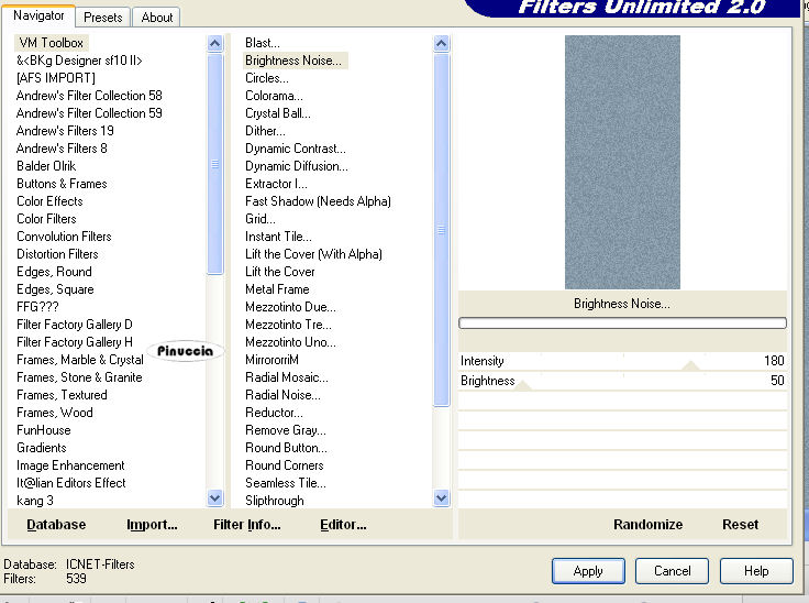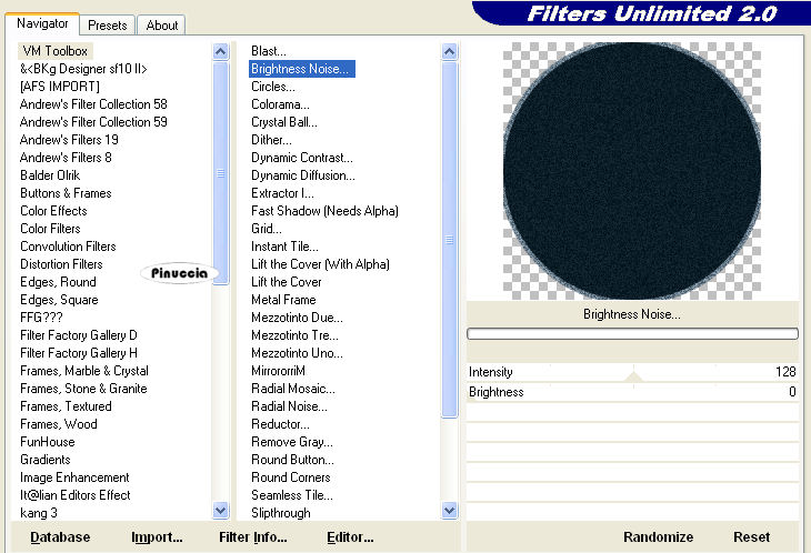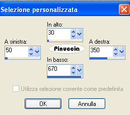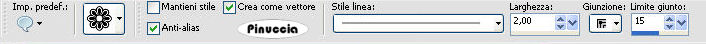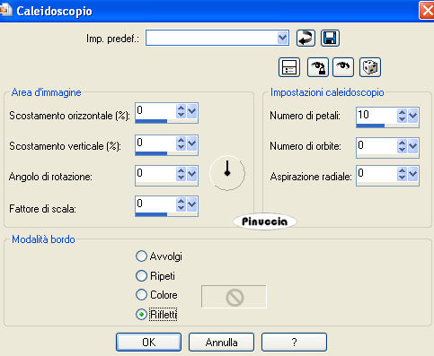 qui puoi trovare qualche risposta ai tuoi dubbi. Se l'argomento che ti interessa non è presente, ti prego di segnalarmelo. Questo tutorial è stato scritto con PSP Corel X2, ma può essere eseguito anche con le precedenti versioni. Per tradurlo, ho usato PSP X. Occorrente: Un tube a scelta. Il resto del materiale qui I tubes usati per i miei esempi sono di Lori Rhai, LCT e Guismo. Filtri: Filters Unlimited qui VM Toolbox - Brightness Noise (nello zip). I filtri VM Toolbox si possono usare importandoli in Filters Unlimited, ma possono funzionare anche da soli. Metti la forma Blumeromana01 nella cartella Forme predefinite. Metti la selezione nella cartella Selezioni. 1. Apri il file di sfondo "hg 01" che ha la corretta dimensione 700 x 700 pixels. Duplicalo usando sulla tastiera la combinazione di tasti shift(maiuscola)+D, e metti da parte l'originale che ti servirà più tardi. Continuerai a lavorare sulla copia, che sarà la base del tuo lavoro. Scegli due colori dal tuo tube. Per il mio esempio ho usato come colore di primo piano il colore chiaro #97AAB9, e come colore di sfondo il colore scuro #192B35, 2. Livelli>Nuovo livello raster. Attiva lo strumento Selezione , cerchio,e disegna un cerchio di 600 x 600 pixels. Mentre disegni il cerchio, puoi controllare la dimensione nella barra inferiore. ![]() Riempi il cerchio con il colore chiaro di primo piano.Selezione>Modifica>Contrai - 10 pixels. Riempi con il colore scuro di sfondo.3. Effetti>Plugins>VM Toolbox - Brightness Noise, con i settaggi standard. ![]() 4. Effetti>Effetti 3D>sfalsa ombra: ![]() Selezione>Deseleziona. Ripeti l'Effetto Sfalsa ombra. 5. Modifica>Taglia. Modifica>Incolla come nuovo livello. Questo posizionerà il cerchio esattamente al centro dell'immagine. Puoi eliminare il livello rimasto vuoto: clicca con il tasto destro del mouse sul livello e scegli Elimina. Attiva il livello superiore. Attiva lo strumento Selezione ![]() clicca sull'icona selezione personalizzata ![]() e imposta i seguenti settaggi. ![]() Riempi con il colore scuro di sfondo.6. Selezione>Modifica>Contrai - 5 pixels. Riempi con il colore chiaro di primo piano.Effetti>Plugins>VM Toolbox - Brightness Noise: ![]() Effetti>Effetti 3D>sfalsa ombra, come al punto 4. Selezione>Deseleziona. Ripeti l'Effetto Sfalsa ombra. 7. Livelli>Nuovo livello raster. Selezione personalizzata ![]() ![]() Riempi con il colore scuro di sfondo.Effetti>Plugins>Filters Unlimited - VM Toolbox - Brighness Noise, come al punto 3. ![]() Selezione>Deseleziona. Effetti>Effetti 3D>sfalsa ombra, come al punto 4. 8. Livelli>Duplica - 3 volte, in modo da avere 4 livelli. Sposta i livelli come nell'esempio.![]() 9.. Apri doodle01 e vai a Modifica>Copia. Torna al tuo lavoro e vai a Modifica>Incolla come nuovo livello. Spostalo un po' più a destra, vedi il mio esempio.Effetti>Effetti 3D>sfalsa ombra, come al punto 4. 10. Livelli>Nuovo livello raster. Selezione>Carica/Salva selezione>Carica selezione da disco. Cerca e carica la selezione "tag-rom-119-1": ![]() Riempi con il colore chiaro di primo piano.Effetti>Plugins>Filters Unlimited - VM Toolbox - Brighness Noise, come al punto 6. ![]() Effetti>Effetti 3D>sfalsa ombra, come al punto 4. Selezione>Deseleziona. 11. Livelli>Nuovo livello raster. Selezione , cerchio, e disegna un cerchio di 366 x 366 pixels.![]() Riempi con il colore chiaro di primo piano (nel mio esempio però ho usato il bianco #ffffff).Effetti>Plugins>Filters Unlimited - VM Toolbox - Brightness Noise, come al punto 6. ![]() Effetti>Effetti 3D>sfalsa ombra, come al punto 4. Selezione>Deseleziona. 12. Posiziona il cerchio al centro e dovresti avere questo.![]() 13. Attiva lo strumento Forme predefinite ![]() seleziona la forma blumeromana01, con i seguenti settaggi: ![]() Se hai usato prima il colore bianco, riporta al colore di primo piano il colore iniziale. Disegna in alto a sinistra una forma 191 x 169 pixels circa: ![]() Livelli>Converti in livello raster. Effetti>Plugins>Filters Unlimited - VM Toolbox - Brightness Noise, come al punto 6. ![]() Effetti>Effetti 3D>sfalsa ombra, come al punto 4 - 2 volte. Inverti i colori nella paletta dei materiali. 14. Disegna un altro fiore con le stesse dimensioni. Livelli>Converti in livello raster. Posiziona i due fiori come nell'esempio.![]() Naturalmente, se preferisci, puoi posizionarli diversamente. 15. Apri il tuo tube e vai a Modifica>Copia. Torna al tuo lavoro e vai a Modifica>Incolla come nuovo livello. Sposta il tube a sinistra, o dove preferisci.Effetti>Effetti 3D>Sfalsa ombra, come al punto 4. 16. Inverti nuovamente i colori in modo da avere il colore scuro come colore di sfondo, e chiudi il colore di primo piano. Attiva lo strumento Testo e scrivi il tuo nome o un testo sull'immagine.Se vuoi, aggiungi anche il tuo watermark. Effetti>Effetti 3D>sfalsa ombra, a tua scelta. 17. Attiva il file di sfondo "hg 01" e vai a Modifica>Copia. Immagine>Aggiungi bordatura, 2 pixels, simmetriche, con il colore #97AAB9. Immagine>Aggiungi bordatura, 50 pixels, simmetriche, con il colore #192B35. 18. Seleziona questo bordo con la bacchetta magica , sfumatura e tolleranza 0,![]() Modifica>Incolla nella selezione. Selezione>Deseleziona. 19. Livelli>Nuovo livello raster. Selezione>Seleziona tutto. Selezione>Modifica>Contrai - 15 pixels. Riempi con il colore chiaro di primo piano.20. Selezione>Modifica>Contrai - 20 pixels. Premi sulla tastiera il tasto canc ![]() Selezione>Deseleziona. 21. Seleziona il bordo chiaro con la bacchetta magica , sfumatura e tolleranza 0.Effetti>Effetti di riflesso>Caleidoscopio: ![]() 22. Livelli>Unisci>Unisci visibile. Effetti>Effetti 3D>Smusso a rilievo. ![]() Selezione>Deseleziona. 23. Immagine>Aggiungi bordatura, 2 pixels, simmetriche, con il colore #97AAB9. Salva in formato jpg. Se hai problemi o dubbi, o trovi un link non funzionante, o anche soltanto per un saluto, scrivimi. 1 Giugno 2009 |