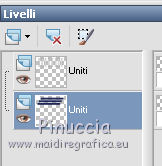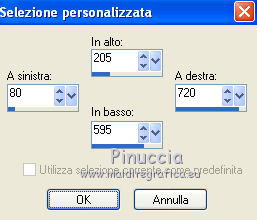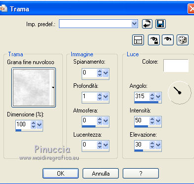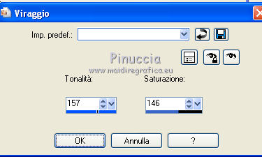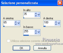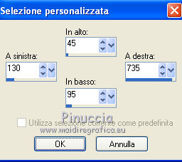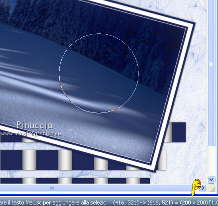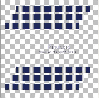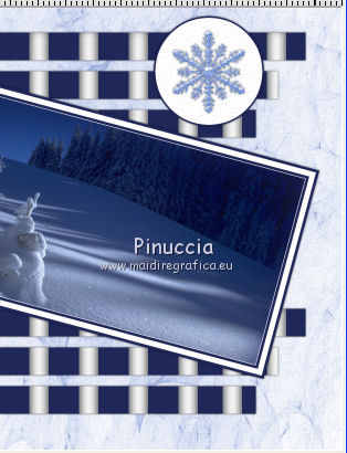 qui puoi trovare qualche risposta ai tuoi dubbi. Se l'argomento che ti interessa non è presente, ti prego di segnalarmelo. Questo tutorial è stato scritto con Corel X3, ma può essere eseguito anche con le precedenti versioni. Per tradurlo, ho usato PSP X. Occorrente: Un tube a scelta. Il resto del materiale qui Per il mio esempio ho usato un poser di Romana. Filtri: FM Tile Tools - Blend Emboss qui Xero - Porcelain qui ![]() 1. Apri una nuova immagine trasparente 800 x 800 pixels. Scegli due colori dal tuo tube. Per l'esempio: Imposta il colore di primo piano con il bianco #ffffff, e il colore di sfondo con #21295a. 2. Attiva lo strumento Selezione ,clicca sull'icona Selezione personalizzata ![]() e imposta i seguenti settaggi: ![]() Riempi la selezione con il colore di sfondo.Selezione>Deseleziona. 3. Livelli>Duplica - 2 volte, e disponi le strisce come nell'esempio.![]() Livelli>Unisci>Unisci visibile. 4. Livelli>Nuovo livello raster. Selezione personalizzata ![]() ![]() Riempi la selezione con il colore di primo piano.Mantieni selezionato. 5. Livelli>Nuovo livello raster. Effetti>Effetti 3D>Ritaglio. ![]() Selezione>Deseleziona. Livelli>Unisci>Unisci giù. 6. Livelli>Duplica - 7 volte in modo da avere in totale 8 livelli. Disponi i livelli come nell'esempio.![]() Chiudi il livello inferiore. Livelli>Unisci>Unisci visibile. E adesso avrai due livelli uniti. 6. Riapri e attiva il livello inferiore. ![]() Selezione>Seleziona tutto. Selezione>Mobile. Selezione>Immobilizza. Selezione>Inverti. 8. Attiva il livello superiore. Premi sulla tastiera il tasto CANC. ![]() Selezione>Deseleziona. Livelli>Unisci>Unisci visibile. 9. Livelli>Duplica. Sposta l'immagine in basso, come nell'esempio.![]() 10. Effetti>Effetti 3D>Sfalsa ombra. ![]() 11. Attiva il livello inferiore. Modifica>Ripeti Sfalsa ombra. 12. Attiva nuovamente il livello superiore. Livelli>Nuovo livello raster. Riempi con il colore di primo piano.Effetti>Effetti di trama>Trama - seleziona una trama - per l'esempio ho scelto Grana fine nuvoloso - con i seguenti settaggi. ![]() Livelli>Disponi>Porta sotto. 12. Rimani posizionato su questo livello. Livelli>Nuovo livello raster. Selezione>Seleziona tutto. Apri il frattale "Apo3D-37-bd-17-11-11" e vai a Modifica>Copia. Torna al tuo lavoro e vai a Modifica>Incolla nella selezione. Selezione>Deseleziona. Abbassa l'opacità di questo livello al 50%. Effetti>Effetti di trama>Trama, con i settaggi precedenti. 13. Attiva il livello superiore. Selezione personalizzata ![]() ![]() Riempi la selezione con il colore di sfondo.14. Selezione>Modifica>Contrai - 5 pixels. Riempi con il colore di primo piano.Selezione>Modifica>Contrai - 10 pixels. Riempi con il colore di sfondo.Selezione>Modifica>Contrai - 5 pixels. Riempi con il colore di primo piano.Selezione>Modifica>Contrai - 1 pixel. Riempi con il colore di sfondo.15. Mantieni selezionato. Apri il tube del paesaggio e vai a Modifica>Copia. Torna al tuo lavoro e vai a Modifica>Incolla come nuovo livello. Posiziona correttamente il tube nell'area selezionata.Selezione>Inverti. Premi sulla tastiera il tasto CANC. Selezione>Deseleziona. Livelli>Unisci>Unisci giù. 16. Immagine>Ruota per gradi - 15 gradi a destra. ![]() Effetti>Effetti 3D>Sfalsa ombra, con i settaggi precedenti. 17. Livelli>Nuovo livello raster. Attiva lo strumento Selezione , cerchio,e disegna un cerchio di 200 x 200 pixels. Mentre disegni il cerchio puoi controllare la dimensione nella barra inferiore, a destra. ![]() Riempi la selezione con il colore di sfondo.18. Selezione>Modifica>Contrai - 3 pixels. Riempi con il colore di primo piano.Effetti>Effetti di trama>Trama, con i settaggi precedenti. Selezione>Deseleziona. 19. Apri il tube "blue-schneeflocken". Scegli e seleziona un fiocco di neve.Modifica>Copia. Torna al tuo lavoro e vai a Modifica>Incolla come nuovo livello. Sposta il fiocco al centro del cerchio.Effetti>Effetti 3D>Sfalsa ombra, con i settaggi precedenti. Livelli>Unisci>Unisci giù. Effetti>Effetti 3D>Sfalsa ombra, con i settaggi precedenti. 20. Sposta il cerchio in alto a destra - vedi il mio esempio.![]() Livelli>Duplica. Immagine>Ridimensiona, all'80%, tutti i livelli non selezionato. 21. Effetti>Plugins>FM Tile Tools - Blend Emboss, con i settaggi standard. ![]() Livello>Duplica. Immagine>Ridimensiona, all'80%, tutti i livelli non selezionato. Effetti>Plugins>FM Tile Tools- Blend Emboss, con i settaggi standard. 22. Sposta i cerchi in alto a destra, come nell'esempio.![]() Livelli>Unisci>Unisci giù - 2 volte. Livelli>Duplica. Immagine>Rifletti. Immagine>Capovolgi. 23. Apri il tube dei testi "WordArt-Winter11-07". Scegli e seleziona un testo adatto alla tua immagine.Modifica>Copia. Torna al tuo lavoro e vai a Modifica>Incolla come nuovo livello. Regola>Tonalità e saturazione>Viraggio. ![]() Sposta il testo nel riquadro con il paesaggio.Effetti>Effetti 3D>Sfalsa ombra, con i settaggi precedenti, ma con il colore bianco. ![]() se vuoi usare il mio testo qui 24. Apri il tuo tube e vai a Modifica>Copia. Torna al tuo lavoro e vai a Modifica>Incolla come nuovo livello. Immagine>Ridimensiona, se e quanto necessario. Posiziona il tube a destra.Effetti>Effetti 3D>Sfalsa ombra. ![]() 25. Aggiungi il tuo nome e/o il tuo watermark su un nuovo livello. Effetti>Effetti 3D>Sfalsa ombra a tua scelta. 26. Immagine>Aggiungi bordatura, 1 pixel, simmetriche, con il colore di sfondo #21295a. Immagine>Aggiungi bordatura, 1 pixel, simmetriche, con il colore di primo piano #ffffff. Immagine>Aggiungi bordatura, 5 pixels, simmetriche, con il colore di sfondo #21295a. Immagine>Aggiungi bordatura, 10 pixels, simmetriche, con il colore #ffffff. Immagine>Aggiungi bordatura, 5 pixels, simmetriche, con il colore di sfondo #21295a. Immagine>Aggiungi bordatura, 1 pixel, simmetriche, con il colore di primo piano #ffffff. Immagine>Aggiungi bordatura, 1 pixel, simmetriche, con il colore di sfondo #21295a. 27. Effetti>Plugins>Xero - Porcelain, con i settaggi standard. Salva in formato jpg. Se hai pro