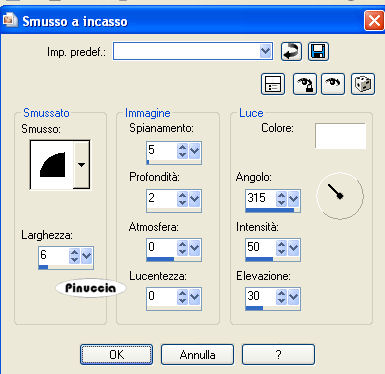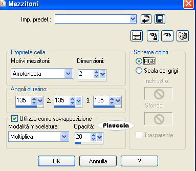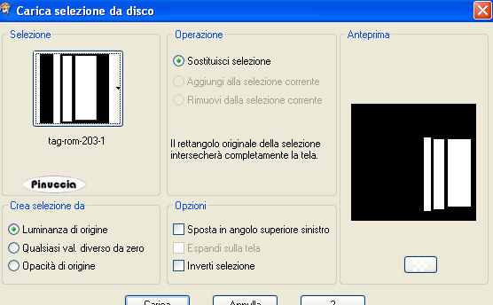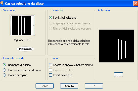qui puoi trovare qualche risposta ai tuoi dubbi. Se l'argomento che ti interessa non è presente, ti prego di segnalarmelo. Questo tutorial è stato scritto con Corel X3, ma può essere eseguito anche con le precedenti versioni. Per tradurlo, ho usato PSP X. Occorrente: Un tube a scelta. Il resto del materiale qui Per il mio esempio ho usato un poser ©Kreahexe Filtri: Tramages - Tow The Line qui Simple qui Metti le selezioni nella cartella Selezioni. 1. Apri l'immagine di sfondo "Hintergrund". Questa immagine, che ha la dimensione di 800 x 750 pixels, sarà la base del tuo lavoro. Scegli due colori dai tuoi tubes. Imposta il colore di primo piano con il colore rosa#AF497F, e il colore di sfondo con il colore turchese #6BA4B6. 2. Livelli>Nuovo livello raster. Attiva lo strumento Selezione ,clicca sull'icona Selezione personalizzata ![]() e imposta i seguenti settaggi: ![]() Riempi la selezione con il colore di sfondo (tasto destro del mouse).Selezione>Deseleziona. 3. Sullo stesso livello: Selezione personalizzata ![]() ![]() 4. Effetti>Plugins>Tramages - Two The Line. ![]() Selezione>Deseleziona. 5. Effetti>Effetti 3D>sfalsa ombra. ![]() 6. Livelli>Nuovo livello raster. Selezione personalizzata :![]() Riempi la selezione con il colore di primo piano.Selezione>Deseleziona. 7. Immagine>Ruota per gradi - 20 gradi a destra. ![]() Effetti>Plugins>Tramages - Two The Line, come al punto 4. Effetti>Effetti 3D>Sfalsa ombra, come al punto 5. 8. Sposta l'immagine come nell'esempio.![]() 9. Livelli>Nuovolivello raster. Attiva lo strumento Selezione , ellisse,e traccia un'ellisse della dimensione di circa 690 x 460 pixels. Mentre disegni la forma, puoi controlla la dimensione nella barra inferiore degli strumenti. ![]() Riempi la selezione con il colore bianco #ffffff.10. Regola>Aggiungi/Rimuovi disturbo>Aggiungi disturbo. ![]() 11. Selezione>Modifica>Contrai - 10 pixels. Livelli>Nuovolivello raster. Riempi con il colore di sfondo.Selezione>Deseleziona. 12. Sullo stesso livello: Selezione>Carica/Salva selezione>Carica selezione da disco. Cerca e carica la selezione "tag-rom-203-1". ![]() E' molto probabile che la selezione non sia perfettamente centrata sull'ellisse. In questo caso, collega i livelli delle ellissi, in modo che si possa spostare contemporaneamente. ![]() Sposta le due ellissi, in modo che la selezione copra l'altezza delle forme.![]() 13. Effetti>Plugins>Tramages - Tow The Line, come al punto 4. Selezione>Deseleziona. E avrai questo. ![]() 14. Sullo stesso livello: Selezione>Carica/Salva selezione>Carica selezione da disco. Cerca e carica la selezione "tag-rom-203-2". ![]() Premi sulla tastiera il tasto CANC. Selezione>Deseleziona. Attiva il livello sottostante. ![]() Effetti>Effetti 3D>Sfalsa ombra, come al punto 5. 15. Attiva nuovamente il livello superiore. Livelli>Unisci>Unisci giù, e dovresti avere questo. ![]() 16. Livelli>Nuovo livello raster. Attiva lo strumento Selezione , Stella 1,e traccia una stella della dimensione di circa 510 x 510 pixels. Riempi la selezione con il colore di primo piano.Selezione>Deseleziona. 17. Immagine>ruota per gradi - 15 gradi a sinistra. ![]() Effetti>Effetti 3D>Sfalsa ombra, come al punto 5. 18. Sposta la stella come nell'esempio.![]() 19. Selezione personalizzata :![]() Riempi la selezione con il colore di sfondo.Selezione>Deseleziona. Effetti>Effetti 3D>Sfalsa ombra, come al punto 5. 20. Livelli>Nuovo livello raster. Selezione personalizzata come al punto 19.Riempi la selezione con il colore di primo piano.Selezione>Deseleziona. Effetti>Effetti 3D>Sfalsa ombra, come al punto 5. Immagine>Ridimensiona, al 90%, tutti i livelli non selezionato. 21. Livelli>Nuovo livello raster. Selezione personalizzata come al punto 19.Riempi la selezione con il colore di sfondo.Selezione>Deseleziona. Effetti>Effetti 3D>Sfalsa ombra, come al punto 5. Immagine>Ridimensiona, all'80%, tutti i livelli non selezionato. 22. Sposta le strisce come nell'esempio.![]() 23. Livelli>Nuovo livello raster. Attiva nuovamente lo strumento Selezione , stella 1,e traccia una stella di circa 200 x 200 pixels. Riempi con il colore di primo piano.Selezione>Deseleziona. Immagine>Ruota per gradi - 15 gradi a destra. Effetti>Effetti 3D>Sfalsa ombra, come al punto 5. Sposta questa stella a destra, come nel mio esempio.24. Livelli>Nuovo livello raster. Ancora Selezione , stella 1,e traccia delle piccole stelle di varie dimensioni. Vedi il mio esempio per orientarti. ![]() Assicurati che la modalità di corrispondenza dello strumento Riempimento sia imposta su Nessuno. ![]() Riempi la selezione con il colore di primo piano.Effetti>Effetti 3D>Sfalsa ombra, come al punto 5. Selezione>Deseleziona. 25. Livelli>nuovo livello raster. Disegna altre piccole stelle - vedi il mio esempio. Riempi la selezione con il colore di sfondo.Effetti>Effetti 3D>Sfalsa ombra, come al punto 5. Selezione>Deseleziona. ![]() 26. Apri il tuo tube e via a Modifica>Copia. Torna al tuo lavoro e vai a Modifica>Incolla come nuovo livello. Immagine>Ridimensiona, se e quanto necessario, e posiziona correttamente il tube.Effetti>Effetti 3D>Sfalsa ombra: ![]() 27. Attiva lo strumento Testo e scrivi un testo o il tuo nome.Aggiungi, se vuoi, il tuo watermark. Effetti>Effetti 3D>Sfalsa ombra, a tua scelta. 28. Immagine>Aggiungi bordatura, 2 pixels, simmetriche, con il colore #AF497F. Immagine>Aggiungi bordatura, 20 pixels, simmetriche, con il colore #6BA4B6. Seleziona questo bordo con la bacchetta magica , sfumatura e tolleranza 0.Effetti>Plugins>Simple - Diamond. Effetti>Plugins>Simple - 4 Way Average. 29 Regola>Sfocatura>Sfocatura gaussiana - raggio 10. ![]() Effetti>Effetti artistici>Mezzitoni. ![]() 30. Effetti>Effetti 3D>Smusso a incasso. ![]() Selezione>Deseleziona. 31. Immagine>Aggiungi bordatura, 2 pixels, simmetriche, con il colore #AF497F. Hai finito. Puoi salvare il tuo lavoro in formato jpg. Se hai problemi o dubbi, o trovi un link non funzionante, o anche soltanto per un saluto, scrivimi. 19 Marzo 2010 |