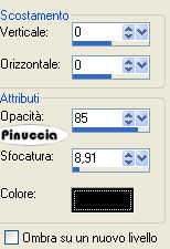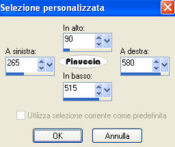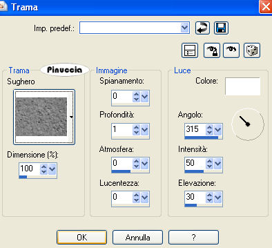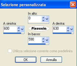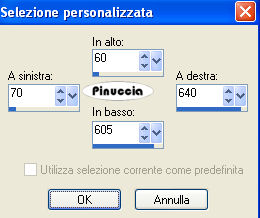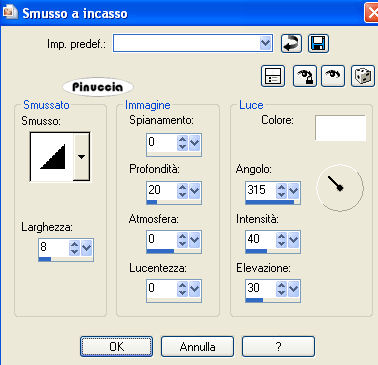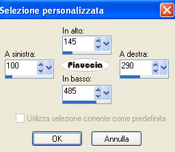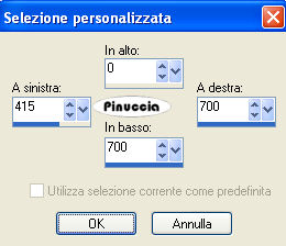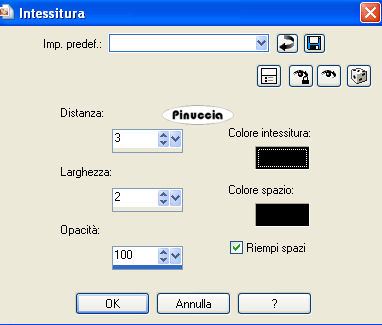 qui puoi trovare qualche risposta ai tuoi dubbi. Se l'argomento che ti interessa non è presente, ti prego di segnalarmelo. Questo tutorial è stato scritto con PSP Corel X2, ma può essere eseguito anche con le precedenti versioni. Per tradurlo, ho usato PSP X. Occorrente: A scelta il tube di un personaggio e di una decorazione natalizia. Il resto del materiale qui 1. Apri l'immagine di sfondo "hintergrund". Questa immagine, che ha già la corretta dimensione 700 x 700 pixels, sarà la base del tuo lavoro. Scegli tre colori dai tuoi tubes. Imposta il colore di primo piano con il colore chiaro (il mio #95BE88), e il colore di sfondo con il colore scuro (il mio #25454A). Il terzo colore scelto per il mio esempio è #D6D3C9. 2. Livelli>Nuovo livello raster. Attiva lo strumento Selezione ![]() clicca sull'icona Selezione personalizzata ![]() e imposta i seguenti settaggi: ![]() Riempi con il colore scuro di sfondo.3. Effetti>Effetti di trama>Intessitura, con i seguenti settaggi: ![]() Selezione>Deseleziona. 4. Effetti>Effetti 3D>Sfalsa ombra, con i seguenti settaggi: ![]() 5. Livelli>Nuovo livello raster. Selezione personalizzata :![]() Riempi con il colore chiaro di primo piano.6. Effetti>Effetti di trama>Trama - seleziona una trama a scelta con i seguenti settaggi: ![]() Selezione>Deseleziona. Effetti>Effetti 3D>sfalsa ombra, come al punto 4. 7. Livelli>Nuovo livello raster. Selezione personalizzata :![]() Riempi con il terzo colore #D6D3C9.Effetti>Effetti di trama>Trama, come al punto 6. Selezione>Deseleziona. Effetti>Effetti 3D>Sfalsa ombra, come al punto 4. 8. Livelli>Nuovo livello raster. Selezione personalizzata :![]() Riempi con il colore chiaro di primo piano.Effetti>Effetti di trama>Intessitura, come al punto 3. Selezione>Deseleziona. Effetti>Effetti 3D>sfalsa ombra, come al punto 4. 9. Livelli>Nuovo livello raster. Selezione personalizzata :![]() Riempi con il colore chiaro di primo piano.Effetti>Effetti di trama>Trama, come al punto 6. 10. Selezione>Modifica>Seleziona bordature selezione: ![]() Livelli>Nuovo livello raster. Riempi con il colore scuro di sfondo.11. Effetti>Effetti 3D>Smusso a incasso, con i seguenti settaggi: ![]() Selezione>Deseleziona. Effetti>Effetti 3D>sfalsa ombra, come al punto 4. 12. Attiva il tube di testo "Schriftzug" e vai a Modifica>Copia. Torna al tuo lavoro e vai a Modifica>Incolla come nuovo livello. Immagine>Ridimensiona, 1 volta all'80% e 2 volte al 90%, tutti i livelli non selezionato. Immagine>Ruota per gradi - 90 gradi a sinistra: ![]() Sposta il testo nell'immagine incorniciata.13. Livelli>Nuovo livello raster. Selezione personalizzata :![]() Riempi con il colore scuro di sfondo.14. Effetti>Effetti di Trama>Intessitura, come al punto 3. Selezione>Modifica>Seleziona bordature selezione. ![]() Livelli>Nuovo livello raster. Riempi con il colore di primo piano.Effetti>Effetti 3d>Smusso a incasso, come al punto 11. Selezione>Deseleziona. Effetti>Effetti 3D>sfalsa ombra, come al punto 4. 15. Dovresti avere questo: ![]() 16. Attiva il tube Schneester e vai a Modifica>Copia. Torna al tuo lavoro e vai a Modifica>Incolla come nuovo livello. Spostalo in alto a sinistra.se fatichi a vedere il tube, attiva il puntatore ![]() e la griglia dello strumento identificherà il tube. ![]() Livelli>Duplica. Livelli>Unisci>Unisci giù. Effetti>Effetti 3D>Sfalsa ombra, come al punto 4. 17. Livelli>Duplica. Immagine>Ridimensiona, 2 volte all'80%, tutti i livelli non selezionato. Sposta questa stella sotto la più grande.Livelli>Duplica, e posiziona il duplicato accanto all'altro, vedi il mio esempio.18. Apri il tuo tube della decorazione e vai a Modifica>Copia. Torna al tuo lavoro e vai a Modifica>Incolla come nuovo livello. Spostalo in basso a sinistra.Effetti>Effetti 3D>Sfalsa ombra, come al punto 4. 19. Apri il tube del tuo personaggio e vai a Modifica>copia. Torna al tuo lavoro e vai a Modifica>Incolla come nuovo livello. Spostalo a destra.Effetti>Effetti 3D>sfalsa ombra, come al punto 5. 20. Attiva lo strumento Testo e scrivi il tuo nome o un testo sull'immagine.Se vuoi, aggiungi il tuo watermark. Effetti>Effetti 3D>Sfalsa ombra, come al punto 4. 21. Immagine>Aggiungi bordatura, 5 pixels, simmetriche, con il colore #d6d3c9. Attiva lo strumento Bacchetta magica ![]() ![]() Effetti>Effetti 3D>Smusso a incasso, come al punto 11. Selezione>Deseleziona. 22. Immagine>Aggiungi bordatura, 20 pixels, simmetriche, con il colore #25454A. Seleziona il bordo con la bacchetta magica ![]() Effetti>Effetti di trama>Intessitura, come al punto 3. Selezione>Deseleziona. 23. Immagine>Aggiungi bordatura, 5 pixels, simmetriche, con il colore #d6d3c9. Seleziona il bordo con la bacchetta magica ![]() Effetti>Effetti 3D>Smusso a incasso, come al punto 11. Selezione>Deseleziona. Hai finito. Puoi salvare in formato jpg. Se hai problemi o dubbi, o trovi un link non funzionante, o anche soltanto per un saluto, scrivimi. 1 Dicembre 2008 |