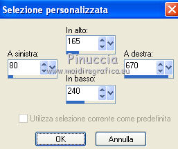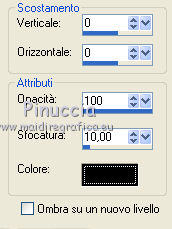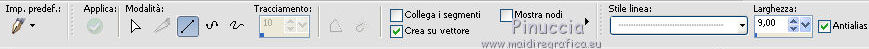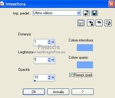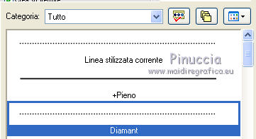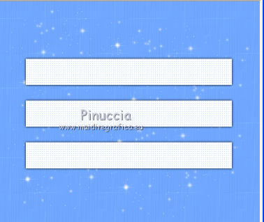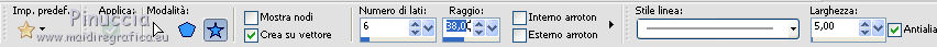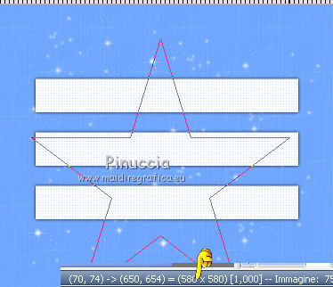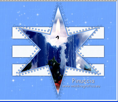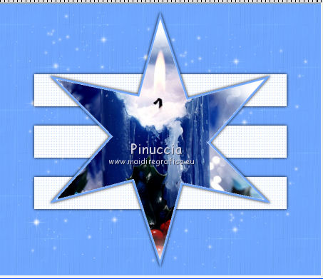 qui puoi trovare qualche risposta ai tuoi dubbi. Se l'argomento che ti interessa non è presente, ti prego di segnalarmelo. Questo tutorial è stato scritto con PSP Corel X2, ma può essere eseguito anche con le precedenti versioni. Per tradurlo, ho usato PSP X. Occorrente: Un tube a scelta. Il resto del materiale qui Per il mio esempio ho usato un poser©Gerda. Filtri: Graphics Plus - Cross Shadow qui ![]() Metti la trama 1609 nella cartella Trame di PSP. Metti Diamant nella cartella Linee di stile di PSP. 1. Apri una nuova immagine trasparente 750 x 635 pixels. Scegli due colori dai tuoi tubes. Per il mio esempio ho impostato il colore di primo piano con il colore blu #71a8ff, e il colore di sfondo con il colore bianco #ffffff. 2. Riempi l'immagine trasparente con il colore di primo piano.Effetti>Effetti di trama>Trama - seleziona la trama 1609 con i seguenti settaggi. ![]() 3. Apri il tube Sterne e vai a Modifica>copia. Torna al tuo lavoro e vai a Modifica>Incolla come nuovo livello. Va bene così. Non occorre spostarlo. 4. Livelli>Nuovo livello raster. Attiva lo strumento Selezione ,clicca sull'icona Selezione personalizzata ![]() e imposta i seguenti settaggi: ![]() Riempi la selezione con il colore di sfondo.5. Effetti>Effetti di trama>Intessitura. ![]() Selezione>Deseleziona. 6. Effetti>Effetti 3D>Sfalsa ombra: ![]() 7. Livelli>Duplica, 2 volte e sposta i duplicati come nell'esempio.per allinearli correttamente, puoi usare le frecce della tastiera. Vedi gli appunti sull'uso delle frecce abbinato allo strumento spostamento qui ![]() 8. Attiva lo strumento Forma simmetrica con i seguenti settaggi.![]() Mantieni i colori come impostati all'inizio del tutorial. 9. Partendo dall'angolo in alto a sinistra disegna una stella della dimensione di 580 x 580 pixels. Mentre disegni la stella puoi controllare la dimensione nella barra inferiore degli strumenti. ![]() 10. Livelli>Converti in livello raster. Sposta la stella al centro dell'immagine.per essere sicuro che la stella si posizioni al centro: Modifica>Taglia e Modifica>Incolla come nuovo livello. Quindi puoi eliminare il livello rimasto vuoto 11. Attiva lo strumento Bacchetta magica , sfumatura e tolleranza 0,e clicca nello spazio bianco della stella per selezionarlo. 12. Apri il tube Devilinside_586_2009 e vai a Modifica>Copia. Torna al tuo lavoro e vai a Modifica>Incolla come nuovo livello. Posiziona la candela nell'area della selezione.Selezione>Inverti. Premi sulla tastiera il tasto CANC. Selezione>Deseleziona. Livelli>Unisci>Unisci giù. Effetti>Effetti 3D>sfalsa ombra, come al punto 6. 13. Se tutto è a posto, dovresti avere questo. ![]() 14. Attiva lo strumento Penna , con i seguenti settaggi,linea di stile diamanti. ![]() ![]() Traccia sulla stella una linea da angolo ad angolo. Livelli>Converti in livello raster. Effetti>Effetti 3D>Sfalsa ombra. ![]() e dovresti avere questo. ![]() 16. Apri il tube ASNOWMANGIFTSHEA e vai a Modifica>copia. Torna al tuo lavoro e vai a Modifica>Incolla come nuovo livello. Sposta il tube a destra.Effetti>Effetti 3D>Sfalsa ombra, come al punto 6. ![]() 17. Apri il tube schneestern e vai a Modifica>copia. Torna al tuo lavoro e vai a Modifica>Incolla come nuovo livello. Sposta il tube sopra la mano del pupazzo di neve (vedi il mio esempio).18. Apri il tube Penguin train, e vai a Modifica>copia. Torna al tuo lavoro e vai a Modifica>Incolla come nuovo livello. Sposta il tube a sinistra, accanto al pupazzo di neve (vedi il mio esempio).Effetti>Effetti 3D>Sfalsa ombra, come al punto 6. 19. Apri il tuo tube e vai a Modifica>copia. Torna al tuo lavoro e vai a Modifica>Incolla come nuovo livello. Sposta il tube a sinistra, come nel mio esempio.Effetti>Effetti 3D>Sfalsa ombra ![]() 20. Attiva lo strumento Testo e scrivi un testo o il tuo nome, senza dimenticare il tuo watermark ed eventuali copyright delle immagini usate.Effetti>Effetti 3D>sfalsa ombra, con settaggi a tua scelta. 21. Immagine>Aggiungi bordatura, 2 pixels, simmetriche, con il colore #ffffff. Immagine>Aggiungi bordatura, 30 pixels, simmetriche, con il colore #71A8FF. Seleziona questo bordo con la bacchetta magica , tolleranza e sfumatura 0,Effetti>Plugins>Graphics Plus - Cross Shadow, con i settaggi standard. ![]() Selezione>Deseleziona. 22. Immagine>Aggiungi bordatura, 2 pixels, simmetriche, con il colore #ffffff. Hai finito. Puoi salvare in formato jpg. ![]() Se hai problemi o dubbi, o trovi un link non funzionante, o anche soltanto per un saluto, scrivimi. 9 Dicembre 2009 |