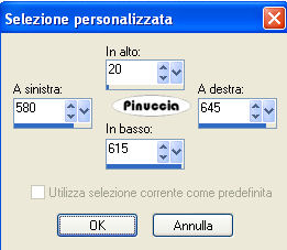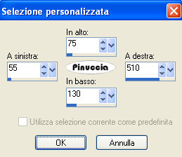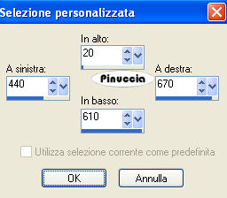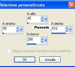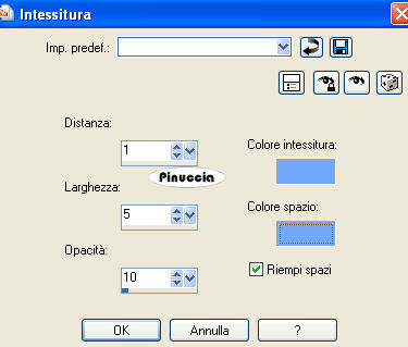 qui puoi trovare qualche risposta ai tuoi dubbi. Se l'argomento che ti interessa non è presente, ti prego di segnalarmelo. Questo tutorial è stato scritto con PSP Corel X2, ma può essere eseguito anche con le precedenti versioni. Per tradurlo, ho usato PSP X. Occorrente: Un tube a scelta. Il resto del materiale qui Per i miei esempi ho usato tubes di Sussu Luz, Bibiche e un poser ©Laguna Azul. Filtri. Penta.com - Jeans qui Graphics Plus - Cross Shadow qui Apri il materiale in PSP, compresa la maschera. 1. Attiva l'immagine di sfondo "hintergrund" che ha la corretta dimensione di 750 x 635 pixels. Questa sarà la base del tuo lavoro. Scegli due colori dal tuo tube. Per il mio esempio ho usato come colore di primo piano il colore chiaro #71a8ff, e come colore di sfondo il bianco #ffffff. 2. Livelli>Nuovo livello raster. Riempi con il colore di primo piano.Livelli>Nuovo livello maschera>Da immagine. Apri il menu sotto la finestra di origine e vedrai la lista dei files aperti, tra questi la maschera. Seleziona la maschera maskerom con i seguenti settaggi: ![]() Livelli>Elimina e rispondi sì alla domanda unire la maschera nel livello corrente. ![]() Livelli>Unisci>Unisci gruppo. 3. Effetti>Effetti 3D>Sfalsa ombra: ![]() 4. Livelli>Nuovo livello raster. Attiva lo strumento Selezione ,clicca sull'icona Selezione personalizzata ![]() e imposta i seguenti settaggi: ![]() Riempi la selezione con il colore di sfondo.5. Effetti>Effetti di trama>Intessitura: ![]() Selezione>Deseleziona. Effetti>Effetti 3D>Sfalsa ombra, come al punto 3. 6. Livelli>Nuovo livello raster. Selezione personalizzata ![]() ![]() Riempi con il colore di primo piano.7. Effetti>Plugins>Penta.com - Jeans: ![]() Selezione>Deseleziona. Effetti 8. Livelli>Nuovo livello raster. Selezione personalizzata ![]() ![]() Riempi con il colore di sfondo.9. Effetti>Effetti di trama>Intessitura, come al punto 5. Selezione>Deseleziona. Effetti 10. Livelli>Nuovo livello raster. Selezione personalizzata ![]() ![]() Riempi con il colore di primo piano.11. Effetti>Plugins>Penta.com - Jeans, come al punto 7. Selezione>Deseleziona. Effetti 12. Attiva lo strumento Penna con i seguenti settaggistile linea rombo. ![]() 13. Passa il bianco a colore di primo piano e traccia 2 linee come nell'esempio. ![]() Livelli>Converti in livello raster. Effetti>Effetti 3D>Sfalsa ombra, come al punto 3. 14. Livelli>Nuovo livello raster. Attiva lo strumento Selezione , ellisse,e traccia un'ellisse della dimensione 604 x 362 pixels. Mentre disegni l'ellisse puoi controllare la dimensione nella barra inferiore: ![]() una volta disegnata l'ellisse, se vuoi spostarla, puoi farlo tenendo premuto il tasto destro del mouse, oppure puoi farlo normalmente con lo strumento Spostamento dopo aver deselezionato. Riempi la selezione con il colore di primo piano.15. Selezione>Modifica>Contrai - 5 pixels. Riempi con il colore di sfondo.Selezione>Modifica>Contrai - 5 pixels. Riempi con il colore di primo piano.16. Mantieni selezionato. Apri il tube del paesaggio "aaabibichewaits012" e vai a Modifica>Copia. Torna al tuo lavoro e vai a Modifica>Incolla nella selezione. Sposta il tube un po' più a sinistra, come nell'esempio.![]() Selezione>Deseleziona. Effetti>Effetti 3D>Sfalsa ombra, come al punto 3. 17. Attiva lo strumento Forma simmetrica ![]() ![]() 18. Riporta i colori della paletta come all'inizio (blu primo piano; bianco sfondo), e traccia una forma della dimensione di 200 x 200 pixels. ![]() Livelli>Converti in livello raster. Posiziona la forma in alto a destra.Attiva lo strumento Bacchetta magica , sfumatura e tolleranza 0,e clicca nella stella per selezionarla. 19. Effetti>Effetti di trama>Intessitura, come al punto 5. Selezione>Deseleziona. Effetti>Effetti 3D>sfalsa ombra, come al punto 3. 20. Apri il tube delle candele JDDCandlePspScript e vai a Modifica>copia. Torna al tuo lavoro e vai a Modifica>Incolla come nuovo livello. Spostalo in basso a destra.Effetti>Effetti 3D>Sfalsa ombra: ![]() 21. Apri il tuo tube e vai a Modifica>copia. Torna al tuo lavoro e vai a Modifica>Incolla come nuovo livello. Spostalo a sinistra, come nel mio esempio.Effetti>Effetti 3D>sfalsa ombra, con i settaggi precedenti. ![]() 22. Attiva lo strumento Testo , scegli un font e scrivi un testo sull'immagine,o il tuo nome e/o il tuo watermark. Non dimenticare eventuali copyright delle immagini che hai usato. Effetti>Effetti 3D>Sfalsa ombra, con un settaggio a tua scelta. 23. Immagine>Aggiungi bordatura, 2 pixels, simmetriche, con il colore #006ECA. Immagine>Aggiungi bordatura, 55 pixels, simmetriche, con il colore #ffffff. Seleziona questo bordo con la bacchetta magica ![]() e riempi con il colore di primo piano.24. Effetti>Plugins>Graphics Plus - Cross Shadow. ![]() 25. Effetti>Plugins>Penta.com - Jeans, come al punto 7. Effetti>Effetti 3D>Ritaglio. ![]() 26. Immagine>Aggiungi bordatura, 1 pixel, simmetriche, con il colore #006ECA. Hai finito. Puoi salvare in formato jpg. ![]() Se hai problemi o dubbi, o trovi un link non funzionante, o anche soltanto per un saluto, scrivimi. 3 Dicembre 2009 |