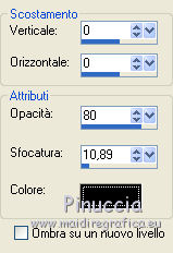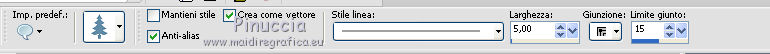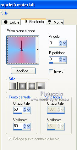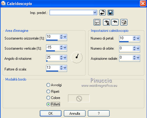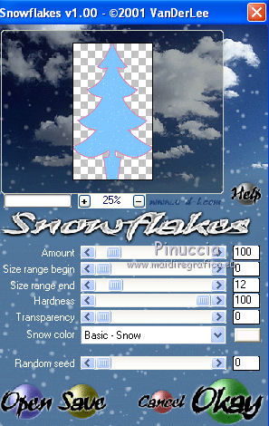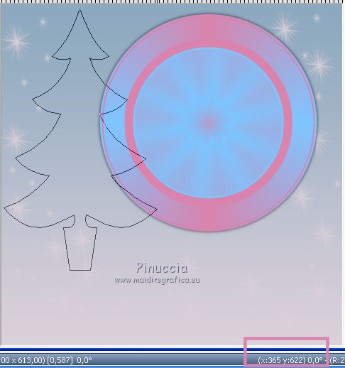 qui puoi trovare qualche risposta ai tuoi dubbi. Se l'argomento che ti interessa non è presente, ti prego di segnalarmelo. Questo tutorial è stato scritto con Corel X3, ma può essere eseguito anche con le precedenti versioni. Per tradurlo, ho usato PSP X. Occorrente: Un tube a scelta. Il resto del materiale qui Il tube che ho usato è un poser di Gerda. Filtri. Graphics Plus - Cross Shadow qui Xero - Porcelain qui VDL Adrenaline - Snowflakes qui ![]() Metti la forma "christbaumromana2" nella cartella Forme predefinite. 1. Apri una nuova immagine trasparente 800 x 800 pixels. Scegli due colori dal tuo tube. Per l'esempio: Imposta il colore di primo piano con il colore rosa #da84ad, e il colore di sfondo con il colore blu #7dc6ff. 2. Riempi l'immagine trasparente con il colore di primo piano.Passa il colore di primo piano a Gradiente: ![]() 3. Apri il file di sfondo "hintergrund" e vai a Modifica>Copia. Torna al tuo lavoro e vai a Modifica>Incolla come nuovo livello. Abbassa l'opacità di questo livello all'80%. 4. Livelli>Nuovo livello raster. Attiva lo strumento Selezione , cerchio,e traccia un cerchio di 510 x 510 pixels. Mentre disegni il cerchio puoi controllare la dimensione nella barra inferiore. Riempi la selezione con il gradiente.5. Selezione>Modifica>Contrai - 5 pixels. Riempi con il colore di primo piano.Selezione>Modifica>Contrai - 3 pixels. Riempi con il gradiente.6. Selezione>Modifica>Contrai - 50 pixels. Riempi con il colore di primo piano.Selezione>Modifica>Contrai - 20 pixels. Riempi con il colore di sfondo.7. Selezione>Modifica>Contrai - 5 pixels. Riempi con il gradiente.Effetti>Effetti di riflesso>Caleidoscopio. ![]() Selezione>Deseleziona. 8. Effetti>Effetti 3D>Sfalsa ombra. ![]() Sposta il cerchio nell'angolo in alto a destra (vedi il mio esempio).9. Attiva lo strumento Forme predefinite ![]() seleziona la forma "christabraumromana2" con i seguenti settaggi. ![]() Assicurati che i colori della paletta siano quelli iniziali. 10. Partendo dall'angolo in alto a sinistra, traccia una forma di 365 x 622 pixels. ![]() Livelli>Converti in livello raster. 11. Attiva lo strumento Bacchetta magica , sfumatura e tolleranza 0,e clicca al centro dell'albero per selezionarlo. 12. Effetti>Plugins>VDL Adrenaline - Snowflakes. ![]() Selezione>Deseleziona. Effetti>Effetti 3D>Sfalsa ombra, come al punto 8. 13. Sposta l'albero al centro dell'immagine, e un po' più in basso.(vedi il mio esempio per orientarti). 14. Attiva nuovamente lo strumento Forme predefinite con i settaggi precedenti,e traccia la forma di 430 x 770 pixels circa. ![]() Livelli>Converti in livello raster. 15. Clicca al centro dell'albero con la bacchetta magica ![]() Effetti>Plugins>VDL Adrenaline - Snowflakes, con i settaggi precedenti. Selezione>Deseleziona. 16. Effetti>Effetti 3D>Sfalsa ombra, come al punto 8. Sposta quest'albero a sinistra, vicino al bordo.17. Apri il tube della neve "snowdune6" e vai a Modifica>Copia. Torna al tuo lavoro e vai a Modifica>Incolla come nuovo livello. Spostalo in basso a sinistra.Livelli>Duplica. Immagine>Rifletti. Sposta questo duplicato un po' più a destra.Attiva lo strumento Sfumino con i seguenti settaggi.![]() e sfuma il bordo a sinistra del duplicato in modo che si fonda con il tube originale. Livelli>Unisci>Unisci giù. Effetti>Effetti 3D>Sfalsa ombra, come al punto 8. 19. Apri il tuo tube e vai a Modifica>Copia. Torna al tuo lavoro e vai a Modifica>Incolla come nuovo livello. Spostalo a destra.20. Livelli>Duplica e attiva il livello sottostante dell'originale. Regola>Sfocatura>Sfocatura gaussiana - raggio 20. ![]() Effetti>Effetti 3D>Sfalsa ombra, come al punto 8. 21. Effetti>Effetti tecniche di disegno>Pennellate. ![]() 22. Attiva lo strumento Testo ![]() e scrivi - se vuoi - un testo sull'immagine. Aggiungi il tuo nome e/o il tuo watermark su un nuovo livello. Effetti>Effetti 3D>Sfalsa ombra, con settaggi a tua scelta. 23. Immagine>Aggiungi bordatura, 1 pixel, simmetriche, con il colore #DA84AD Immagine>Aggiungi bordatura, 20 pixels, simmetriche, con il colore #7DC6FF. Selezione>Seleziona tutto. Selezione>Modifica>Contrai - 20 pixels. Selezione>Inverti. 24. Effetti>Plugins>Graphics plus - Cross Shadow, con i settaggi standard. ![]() Selezione>Deseleziona. 25. Immagine>Aggiungi bordatura, 1 pixel, simmetriche, con il colore #dA84AD. Salva in formato jpg. Se hai problemi o dubbi, o trovi un link non funzionante, o anche soltanto per un saluto, scrivimi 14 Novembre 2011 |