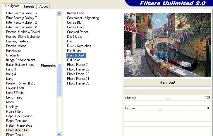 Effetti>Plugins>Filters Unlimited 2.0 - Photo Aging Kit - Hairs & Dust: