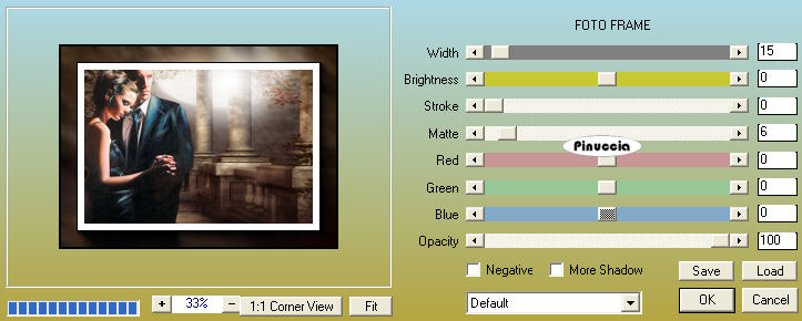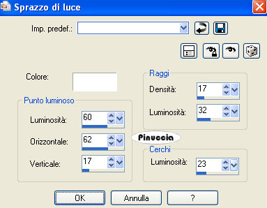 qui puoi trovare qualche risposta ai tuoi dubbi. Se l'argomento che ti interessa non è presente, ti prego di segnalarmelo. Per tradurre questo tutorial ho usato PSP X. Occorrente: Materiale qui Filtri: AAA Multifilter qui Penta.com - Jeans qui ![]() Apri una nuova immagine trasparente 750 x 550 pixels. Selezione>Seleziona tutto. Apri l'immagine Gothic11.jpg e vai a Modifica>copia. Torna al tuo lavoro e vai a Modifica>Incolla nella selezione. Selezione>Deseleziona. Regola>Messa a fuoco>Metti a fuoco. Effetti>Effetti di illuminazione>Sprazzo di luce: ![]() Apri l'immagine Rob_Hefferan_49.jpg. se stai usando versioni inferiori a Corel X2, non potrai aprire il tube salvato con X2. Prendi qui il tube convertito. Attiva lo strumento Selezione a mano libera ![]() e seleziona l'immagine della coppia. Modifica>Copia. Torna al tuo lavoro e vai a Modifica>Incolla come nuovo livello. Immagine>Ridimensiona, al 75%, tutti i livelli non selezionato. Regola>Correzione fotografica intelligente. ![]() Livelli>Unisci>Unisci visibile. Effetti>Plugins>AAA Frames - Foto Frame: ![]() Attiva lo strumento Testo scegli un font e scrivi un testo, con il colore che preferisci.Immagine>Ruota per gradi - 10 gradi a sinistra. ![]() Livelli>Converti in livello raster. Effetti>Plugins>Penta.com - Jeans: ![]() Effetti>Effetti 3D>Sfalsa ombra, con i seguenti settaggi, colore nero. ![]() Aggiungi il tuo nome e/o il tuo watermark. Livelli>Unisci>Unisci tutto e salva in formato jpg. Se hai problemi o dubbi, o trovi un link non funzionante, o anche soltanto per un saluto, scrivimi.