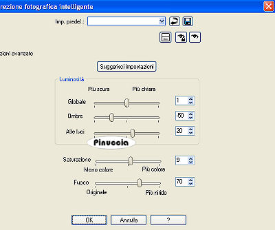 qui puoi trovare qualche risposta ai tuoi dubbi. Se l'argomento che ti interessa non è presente, ti prego di segnalarmelo. Per tradurre questo tutorial ho usato PSP X. Occorrente: Materiale qui Filtri: Lucis Art qui in alternativa all'uso di questo filtro, ho elaborato il tutorial apportando delle varianti, e usando questi filtri: Xero - Porcelain qui e Virtual Photographer qui ![]() Apri l'immagine "palomas 2detalle.jpg". Questa sarà la base del tuo lavoro. Regola>Correzione fotografica intelligente. ![]() Apri l'immagine donaldzolan21.jpg. Attiva lo strumento Selezione a mano libera , da punto a punto,e seleziona l'immagine della madre con la bambina. Modifica>Copia. Torna al tuo lavoro e vai a Modifica>Incolla come nuovo livello. Regola>Rimozione disturbo in un passaggio. Regola>Correzione fotografica intelligente: ![]() Effetti>Plugins>Xero - Porcelain, con i settaggi standard. ![]() Livelli>Unisci>Unisci visibile. Livelli>Duplica. Immagine>Ridimensiona, al 90%, tutti i livelli non selezionato. Effetti>Effetti 3D>Sfalsa ombra, con i seguenti settaggi, colore nero. ![]() Ripeti l'Effetto Sfalsa ombra, cambiando verticale e orizzontale con -5. Selezione>Seleziona tutto. Selezione>Mobile. Selezione>Immobilizza. se vuoi usare il filtro LucisArt - Exposure, questa è la schermata di esempio pubblicata da Rosamaria: ![]() Per il mio esempio. Effetti>Plugins>OptikVerve - Virtual Photographer: ![]() Regola>Luminosità e contrasto: ![]() Selezione>Deseleziona. Attiva il livello di sfondo. Seleziona lo script Trova bordi (colore): ![]() Clicca sulla freccetta nera per far partire lo script e alla fine avrai questo: ![]() Regola>Messa a fuoco>Metti a fuoco. Immagine>Aggiungi bordatura, 2 pixels, simmetriche, con il colore nero. Immagine>Ridimensiona, a 750 pixels di larghezza, tutti i livelli selezionato. ![]() Aggiungi il tuo nome e/o il tuo watermark e salva in formato jpg. Se hai problemi o dubbi, o trovi un link non funzionante, o anche soltanto per un saluto, scrivimi.