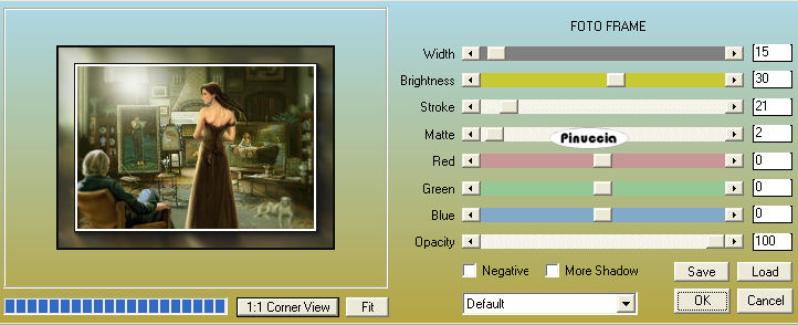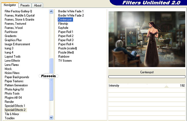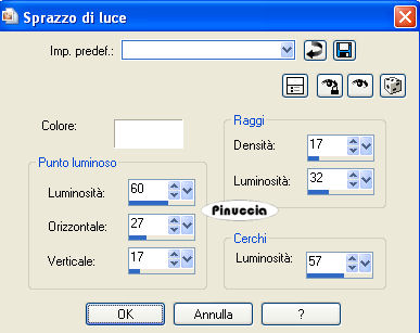 qui puoi trovare qualche risposta ai tuoi dubbi. Se l'argomento che ti interessa non è presente, ti prego di segnalarmelo. Per tradurre questo tutorial ho usato PSP X. Occorrente: Materiale qui Filtri: Filters Unlimited qui Adjust - Variations qui AAAmultifilter qui ![]() Apri una nuova immagine trasparente 750 x 550 pixels. Selezione>Seleziona tutto. Apri l'immagine studio_inthe.jpg e vai a Modifica>copia. Torna al tuo lavoro e vai a Modifica>Incolla nella selezione. Selezione>Deseleziona. Regola>Messa a fuoco>Accentua messa a fuoco. Regola>Rimozione disturbo in un passaggio. Effetti>Effetti di illuminazione>Sprazzo di luce: ![]() Apri il tube GG08~ManInChair_001.psp, e vai a Modifica>copia. Torna al tuo lavoro e vai a Modifica>Incolla come nuovo livello. Spostalo in basso a sinistra.Apri il tube ayanna_vf.psp e vai a Modifica>copia. Torna al tuo lavoro e vai a Modifica>Incolla come nuovo livello. Immagine>Ridimensiona, al 75%, tutti i livelli non selezionato. Immagine>Rifletti. Spostalo al centro - vedi il mio esempio.![]() Livelli>Unisci>Unisci visibile. Effetti>Plugins>Filters Unlimited - Special Effects 2 - Centerspot: ![]() Effetti>Plugins>Adjust - Variations - clicca una volta More Yellow e ok. Effetti>Plugins>AAA Frames - Foto Frame: ![]() Aggiungi il tuo nome e/o il tuo watermark e salva in formato jpg. Se hai problemi o dubbi, o trovi un link non funzionante, o anche soltanto per un saluto, scrivimi.