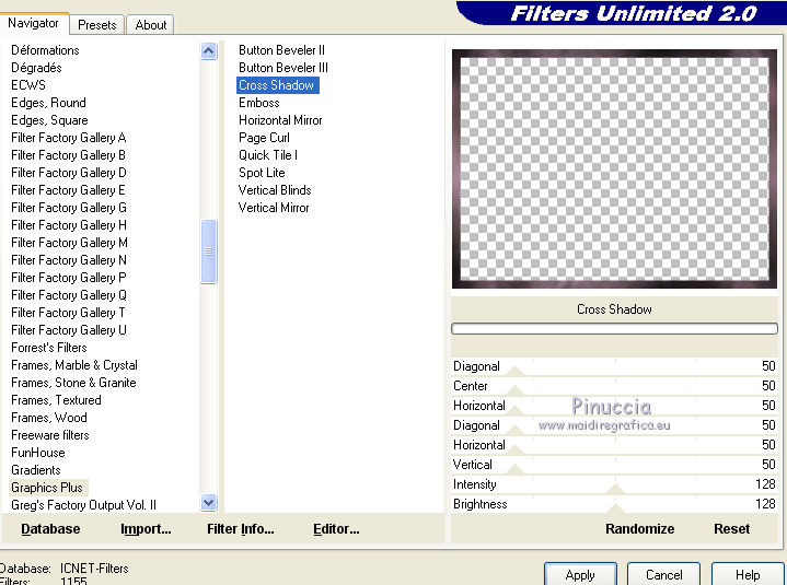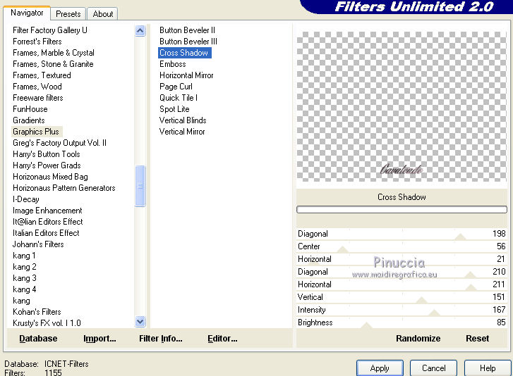 13. Effetti>Plugins>Filters Unlimited 2.0 - Graphics Plus - Cross Shadow.