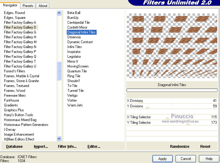 4. Effetti>Plugins>Filters Unlimited 2.0 - Filter Factory D - Diagonal Infini Tiles.