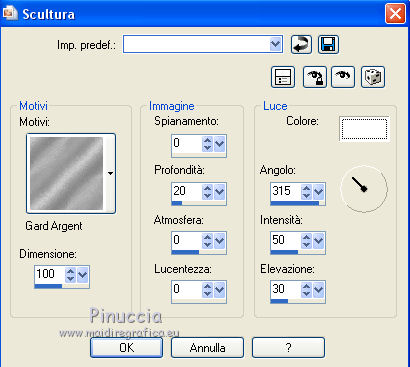 30. Effetti>Effetti di trama>Scultura - seleziona la trama Gard Argent, con i seguenti settaggi.