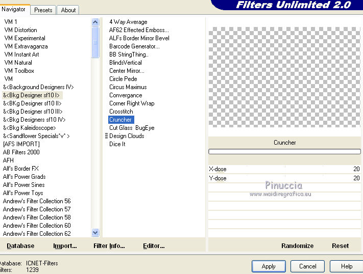 18. Effetti>Plugins>Filters Unlimited 2.0 - &<Bkg Designer sf10I> - Cruncher, con i settaggi standard.