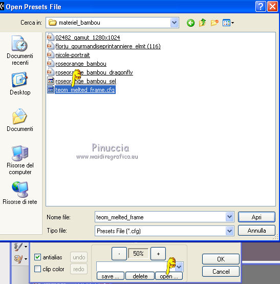 Clicca su Open, e cerca il prest teom_melted_frame nella cartella in cui hai scompattato il materiale