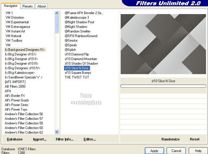 6. Effetti>Plugins>Filters Unlimited 2.0 - &<BKG Designer IV> - sf sliceNdice.