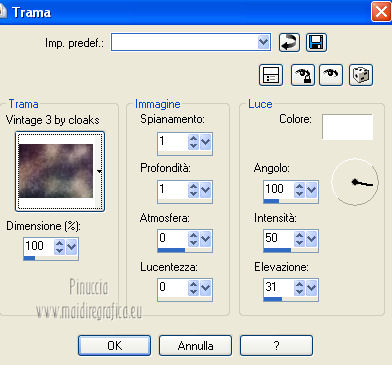 3. Effetti>Effetti di trama>Trama - seleziona la trama "Vintage 3 by cloaks (6)", con i seguenti settaggi.