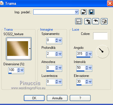 10. Effetti>Effetti di trama>Trama - seleziona la trama "SC022 texture" con i seguenti settaggi.