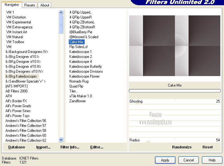3. Effetti>Plugins>Filters Unlimited 2.0 - &<Kaleidoscope> - Cake Mix.