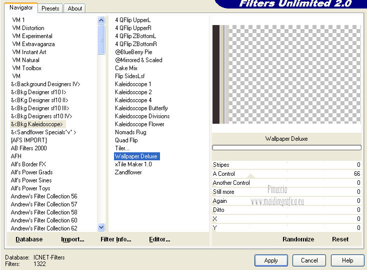 Effetti>Plugins>Filters Unlimited 2.0 - &<Kaleidoscope> - Wallpaper Deluxe, con i settaggi standard.