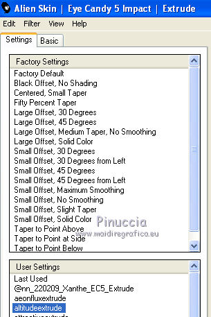 Metti altituderust e altitudeextrude nelle rispettive cartelle del filtro Alien Skin Eye Candy 5 Nature>Settings>Rust e Alien Skin Eye Candy 5 Impact>Settings>Extrude. Doppio clic sul file e il preset sarà automaticamente installato.