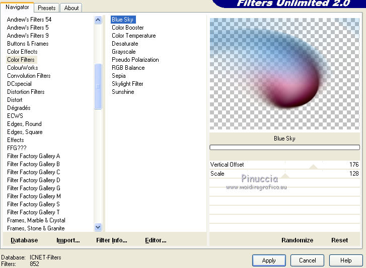 2. Effetti>Plugins>Filters Unlimited - Color filters - Blue Sky con i settaggi standard.