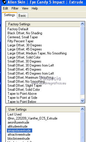 Metti il preset amapolasextrude nella cartella del filtro Alien Skin Eye Candy 5 Impact>Settings>Extrude. Doppio clic sul file e il preset sarà automaticamente installato.