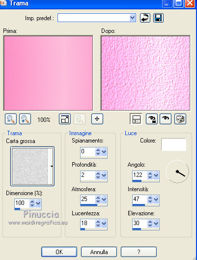 Effetti>Effetti di trama>Trama - seleziona la trama Corel_15_024 o Carta grossa, con i seguenti settaggi.