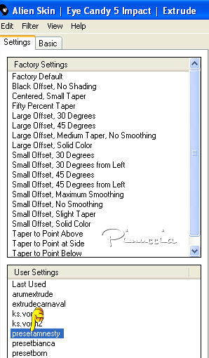 Metti il preset "presetamnesty" nella cartella del filtro Alien Skin Eye Candy 5 Impact>Settings>Extrude. Se preferisci puoi importarlo, quando ti servirà, direttamente dalla cartella in cui hai scompattato il materiale.