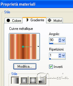 Passa il colore di primo piano a Gradiente, e seleziona il gradiente Cuivre metallique con i seguenti settaggi.