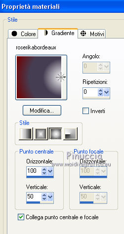 Passa il colore di primo piano a Gradiente, e seleziona il gradiente "roserikabordeaux", con i seguenti settaggi.