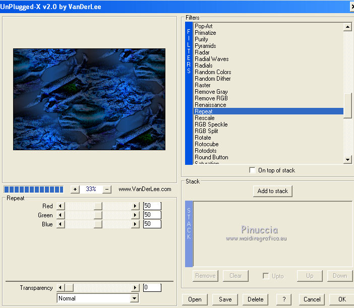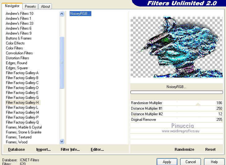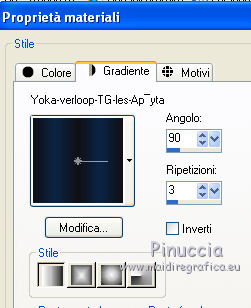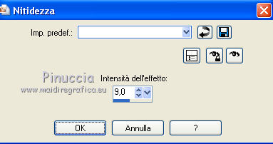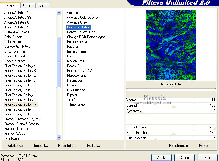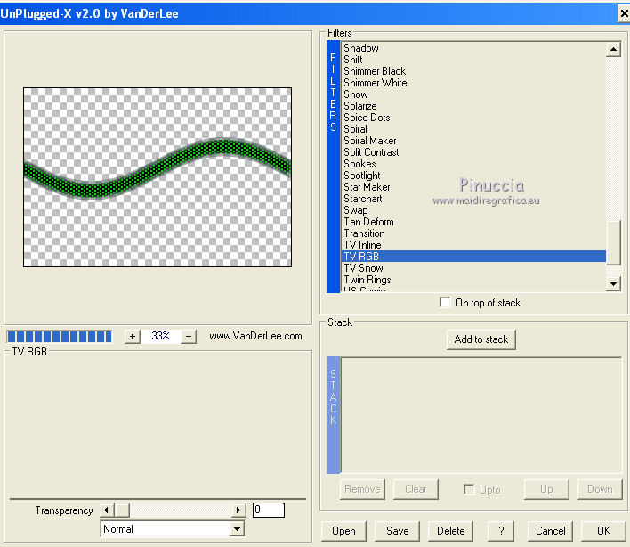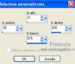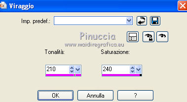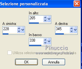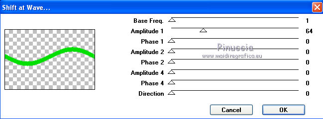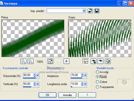segno. Materiale qui Tutto il materiale fa parte della collezione personale di Roserika. Per favore, lascia intatto il copyright. Filtri: Mura's Seamless - Shift at Wave qui Filters Unlimited qui Filter Factory Gallery A qui Filter Factory Gallery H qui Filter Factory Gallery M qui Vanderlee - Unplugged X qui I filtri Factory Gallery per essere usati devono prima essere convertiti. Come fare vedi qui Si usano importandoli in Filters Unlimited (come fare vedi qui) ma possono funzionare anche da soli Metti il gradiente nella cartella Gradienti. Passa il colore di primo piano a Gradiente, seleziona il gradiente Yoka-verloop-TG-les-Apayta, stile lineare. ![]() Selezione>Seleziona tutto. Apri il tube femmechapeau e vai a Modifica>Copia. Torna al tuo lavoro e vai a Modifica>Incolla nella selezione. Effetti>Plugins>Filters Unlimited - Filter factory Gallery H - NoisyRGB, con i settaggi standard. ![]() Selezione>Deseleziona. Effetti>Effetti di immagine>Motivo unico, con i settaggi standard. ![]() Livelli>Nuovo livello raster. Riempi con il gradiente.Cambia la modalità di miscelatura di questo livello in Luce netta. Livelli>Unisci>Unisci visibile. 2. Livelli>Duplica. Effetti>Plugins>Vanderlee - Unplugged X - seleziona Repeat con i settaggi standard. ![]() Cambia la modalità di miscelatura di questo livello in Sovrapponi. Livelli>Unisci>Unisci visibile. Attiva lo strumento Selezione ,clicca sull'icona Selezione personalizzata ![]() e imposta i seguenti settaggi: ![]() Selezione>Innalza selezione a livello. Effetti>Plugins>Filters Unlimited - Filter factory Gallery M - Biohazard filter: ![]() Selezione>Deseleziona. Cambia la modalità di miscelatura di questo livello in Luce netta. 3. Livelli>Duplica. Effetti>Effetti geometrici>Cerchio. ![]() Livelli>Duplica. Immagine>Rifletti. Effetti>Effetti di immagine>Scostamento. ![]() Livelli>Unisci>Unisci giù. Immagine>Ridimensiona, al 30%, tutti i livelli non selezionato. Effetti>Effetti di immagine>Scostamento. ![]() 4. Effetti>Plugins>Vanderlee - Unplugged X - Transition. ![]() Cambia la modalità di miscelatura di questo livello in Luminanza. Regola>Tonalità e saturazione>Viraggio: ![]() 5. Selezione personalizzata ![]() ![]() Imposta il colore di primo piano con #00df00. Livelli>Nuovo livello raster. Riempi la selezione con il colore di primo piano.Selezione>Deseleziona. Effetti>Plugins>Mura's Seamless - Shift at Wave con i settaggi standard. ![]() Effetti>Plugins>Vanderlee - Unplugged X - Defocus. ![]() Effetti>Plugins>Vanderlee - Unplugged X - TV RGB con i settaggi standard. ![]() 6. Cambia la modalità di miscelatura di questo livello in Dissolvi, e abbassa l'opacità al 60%. Effetti>Effetti di distorsione>Increspa: ![]() Livelli>Disponi>Sposta giù (sotto il livello della sfera). Selezione personalizzata come al punto 2.![]() Premi sulla tastiera il tasto CANC. Selezione>Deseleziona. Livelli>Duplica. Immagine>Capovolgi. Cambia la modalità di miscelatura di questo livello in Luminanza. 7. Attiva il livello superiore. Attiva nuovamente il tube femmechapeau e vai a Modifica>Copia. Torna al tuo lavoro e vai a Modifica>Incolla come nuovo livello. Sposta il tube in basso a destra.Effetti>Plugins>Filters Unlimited - Filter Factory Gallery M - Biohazard filter: ![]() Immagine>Ridimensiona, al 70%, tutti i livelli non selezionato. Immagine>Rifletti. Sposta il tube in basso a sinistra.Regola>Messa a fuoco>Metti a fuoco. Effetti>Effetti 3D>Sfalsa ombra, con il colore nero. ![]() 8. Livelli>Nuovo livello raster. Selezione>Seleziona tutto. Modifica>Incolla nella selezione (il tube della donna è ancora in memoria). Effetti>Plugins>Filters Unlimited - Filter Factory Gallery M - Biohazard filters con i settaggi standard. ![]() Effetti>Plugins>Filters Unlimited - Filter Factory Gallery A - Kaleidoscope II, con i settaggi standard. ![]() Selezione>Deseleziona. Immagine>Ridimensiona, al 50%, tutti i livelli non selezionato. 9. Selezione personalizzata ![]() ![]() Selezione>Innalza selezione a livello. Immagine>Ruota per gradi - 90 gradi a sinistra. ![]() Posiziona la selezione come nell'esempio.![]() Livelli>Duplica. immagine>Capovolgi. Livelli>Unisci>Unisci giù. Ripeti Livelli>Unisci>Unisci giù. Immagine>Ridimensiona, al 50%, tutti i livelli non selezionato. Regola>Messa a fuoco>Metti a fuoco. Sposta l'immagine in basso, come nel mio esempio.Livelli>Duplica. Sposta questo duplicato in alto a destra.10. Attiva il livello inferiore. Regola>Luminosità e contrasto>Nitidezza. ![]() Livelli>Unisci>Unisci visibile. Livelli>Duplica. Immagine>Ridimensona, all'80%, tutti i livelli non selezionato. Sposta l'immagine a sinistra.Effetti>Effetti geometrici>Prospettiva orizzontale. ![]() Attiva il livello sottostante. Effetti>Plugins>Vanderlee - Unplugged X - TV RGB con i settaggi standard. Modifica>Incolla come nuovo livello (il tube femmechapeau dovrebbe essere ancora in memoria; se così non fosse, attivalo nuovamente e vai a Modifica>Copia). Spostalo in basso a destra.11. Apri il tube "texte" e vai a Modifica>Copia. Torna al tuo lavoro e vai a Modifica>Incolla come nuovo livello. Spostalo in alto a sinistra.Immagine>Aggiungi bordatura, 20 pixels, simmetriche, con il colore nero. Firma ìl tuo lavoro ed esporta come jpg ottimizzata, compressione 20. ![]() Se hai problemi o dubbi, o trovi un link non funzionante, o anche soltanto per un saluto, scrivimi.