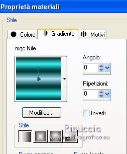 Passa il colore di primo piano a Gradiente, e seleziona il gradiente mqc Nile, con i seguenti settaggi.