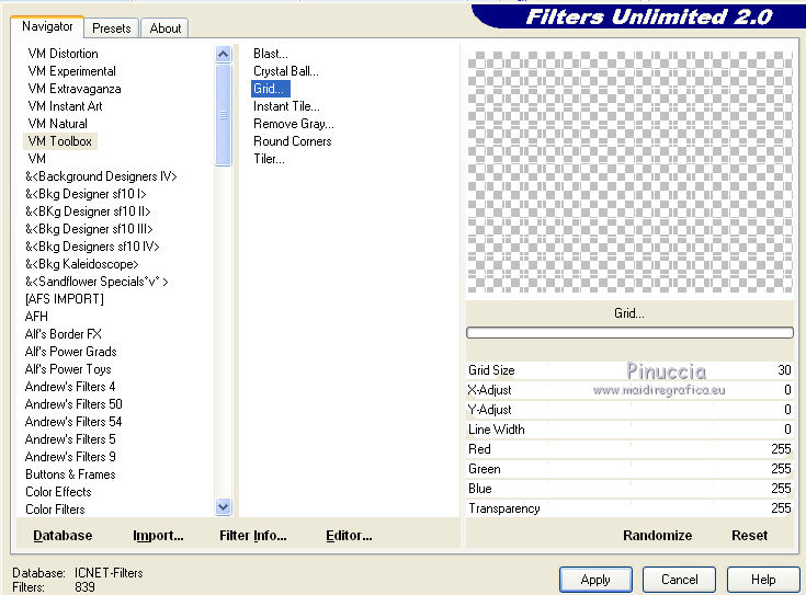 Effetti>Plugins>Filters Unlimited 2.0 - VM Toolbox - Grid, con i settaggi standard.
