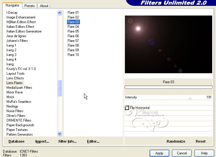Effetti>Plugins>Filters Unlimited 2.0 - Lens Flares - Flare03, con i settaggi standard.