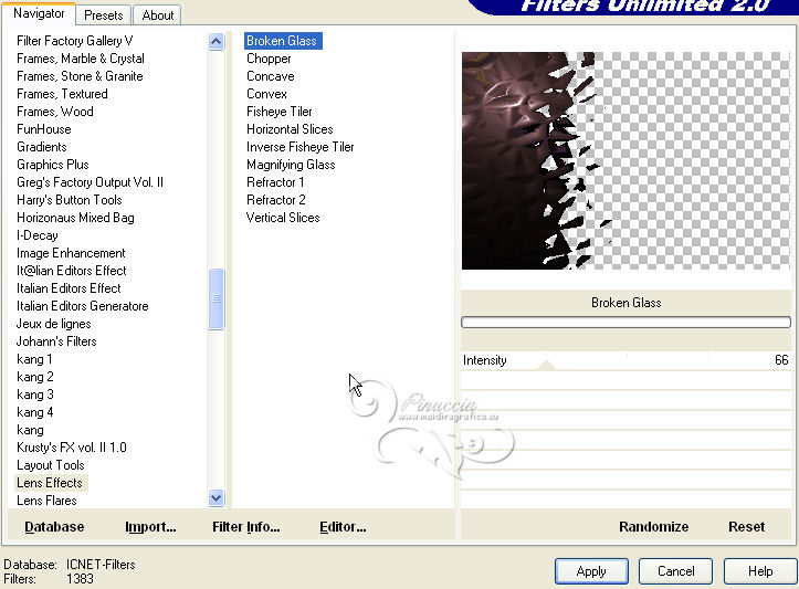 Effetti>Plugins>Filters Unlimited 2.0 - Lens Effects - Broken Glass, con i settaggi standard.