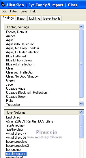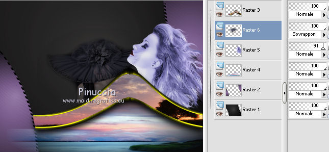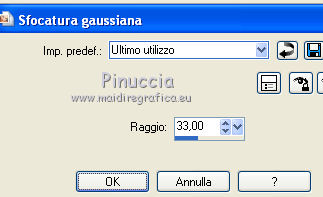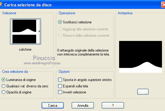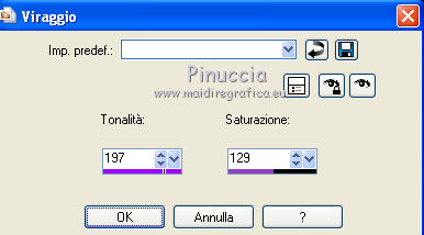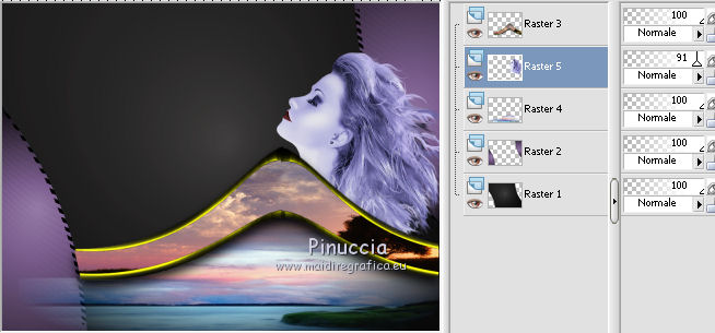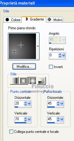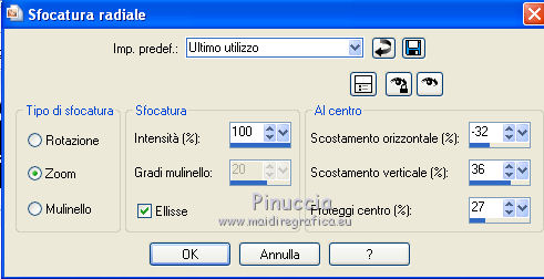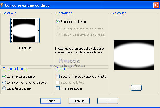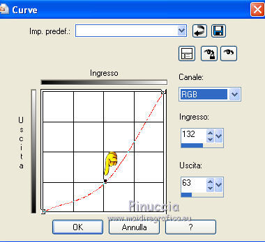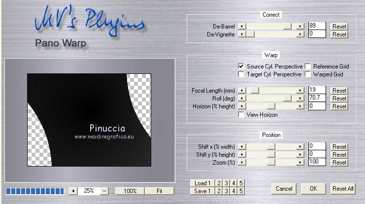 Occorrente: Materiale qui Ti servirà anche la maschera 20-20. Se non hai questa maschera prendila qui Il materiale fa parte della collezione personale di Roserika. Per favore, lascia intatto il copyright. Filtri: Se hai problemi con i filtri, ricordati della mia sezione filtri qui PanoWarp - MV's Plugins qui Alien Skin Eye Candy 5 Impact qui AP (Distort) qui Metti il preset "catchmeglass" nella cartella del filtro Alien Skin Eye Candy 5 Impact>Settings>Glass. Doppio clic sul file e il preset sarà automaticamente installato. Se preferisci puoi importarlo, quando ti servirà, dalla cartella in cui hai scompattato il materiale. Vedi la scheda del filtro qui e come importare un preset in Eye Candy qui Metti la maschera nella cartella Maschere. Metti le selezioni nella cartella Selezioni. 1. Apri una nuova immagine trasparente 1000 x 750 pixels. Imposta il colore di primo piano con #241010, e il colore di sfondo con #e0dae6. Passa il colore di primo piano a Gradiente, stile Sprazzo di luce, con i seguenti settaggi. ![]() Riempi l'immagine trasparente con il gradiente.Regola>Luminosità e contrasto>Curve, tenendo premuto con il mouse il nodo centrale sposta la curva come si vede nella schermata sotto. ![]() Se stai usando le versioni più recenti di PSP, avrai questa schermata. ![]() Effetti>Plugins>MV's Plugins - PanoWarp. ![]() 2. Attiva lo strumento Bacchetta magica ![]() ![]() e clicca sulla parte trasparente in basso a sinistra per selezionarla. ![]() Livelli>Nuovo livello raster. Riempi con il gradiente.Effetti>Plugins>AP(Distort) - CuttingEdges. ![]() Selezione>Deseleziona. Livelli>Duplica. Immagine>Rifletti. Immagine>Capovolgi. Livelli>Unisci>Unisci giù. Regola>Tonalità e saturazione>Viraggio. ![]() 3. Apri il tube "formes". Attiva il livello Raster 1 e vai a Modifica>Copia. Torna al tuo lavoro e vai a Modifica>Incolla come nuovo livello. Effetti>Effetti di immagine>Scostamento. ![]() Apri il tube "paysage2" e vai a Modifica>Copia. Torna al tuo lavoro e vai a Modifica>Incolla come nuovo livello. Effetti>Effetti di immagine>Scostamento. ![]() Livelli>Disponi>Sposta giù (sotto il livello del tube "forme"). Selezione>Carica/Salva selezione>Carica selezione da disco. Cerca e carica la forma "catchme". ![]() Selezione>Inverti. Premi sulla tastiera il tasto CANC. Selezione>Deseleziona. 4. Attiva il livello superiore. Selezione>Carica/Salva selezione>Carica selezione da disco. Cerca e carica la forma "catchme2". ![]() Apri il tube "paysage1" e vai a Modifica>Copia. Torna al tuo lavoro e vai a Modifica>Incolla nella selezione. Selezione>Deseleziona. Effetti>Effetti 3D>Sfalsa ombra, con il colore nero. ![]() Attiva il livello del primo paesaggio. Apri il tube "portraitfemme" e vai a Modifica>Copia. Torna al tuo lavoro e vai a Modifica>Incolla come nuovo livello. Sposta il tube a destra, come nel mio esempio.Abbassa l'opacità di questo livello al 91%. ![]() Apri il tube "femmechapeau" e vai a Modifica>Copia. Torna al tuo lavoro e vai a Modifica>Incolla come nuovo livello. Spostalo accanto al tube precedente.Vedi l'esempio finale. Cambia la modalità di miscelatura di questo livello in Sovrapponi. ![]() 5. Attiva il livello superiore. Attiva nuovamente il tube "formes" e copia il livello Raster 2. Torna al tuo lavoro e vai a Modifica>Incolla come nuovo livello. Effetti>Effetti di immagine>Scostamento. ![]() Selezione>Carica/Salva selezione>Carica selezione da disco. Cerca e carica la forma "catchme3". ![]() Effetti>Plugins>Alien Skin Eye Candy 5 Impact - Glass. Seleziona il preset "catchmeglass" e ok. ![]() Selezione>Deseleziona. Livelli>Unisci>Unisci visibile. 6. Apri il tube "homme" e vai a Modifica>Copia. Torna al tuo lavoro e vai a Modifica>Incolla come nuovo livello. Sposta il tube in basso a sinistra, come nel mio esempio.Apri il tube "spheres" e vai a Modifica>Copia. Torna al tuo lavoro e vai a Modifica>Incolla come nuovo livello. Spostalo a destra, come nel mio esempio.Livelli>Unisci>Unisci visibile. Livelli>Nuovo livello raster. Riempi con il gradiente.Livelli>Carica/Salva maschera>Carica maschera da disco. Cerca e carica la maschera 20-20. ![]() Livelli>Unisci>Unisci gruppo. Regola>Tonalità e saturazione>Viraggio. ![]() Cambia la modalità di miscelatura di questo livello in Moltiplica. Selezione>Carica/Salva selezione>Carica selezione da disco. Cerca e carica la forma "catchme4". ![]() Premi sulla tastiera il tasto CANC. Selezione>Deseleziona. Regola>Sfocatura>Sfocatura gaussiana - raggio 33. ![]() Regola>Aggiungi/Rimuovi disturbo>Aggiungi disturbo. ![]() 7. Livelli>Duplica. Effetti>Effetti geometrici>Cerchio. ![]() Immagine>Ridimensiona, al 60%, tutti i livelli non selezionato. Regola>Sfocatura>Sfocatura radiale. ![]() Cambia la modalità di miscelatura di questo livello in Filtra. Regola>Tonalità e saturazione>Viraggio. ![]() Effetti>Effetti di immagine>Scostamento. ![]() Livelli>Duplica. Immagine>Rifletti. Immagine>Capovolgi. Cambia la modalità di miscelatura di questo livello in Dissolvi, e abbassa l'opacità al 14%. Immagine>Aggiungi bordatura, 20 pixels, simmetriche, con il colore nero. Firma il tuo lavoro ed esporta come jpg ottimizzata, compressione 20. ![]() ![]() Se hai problemi o dubbi, o trovi un link non funzionante, o anche soltanto per un saluto, scrivimi. |
