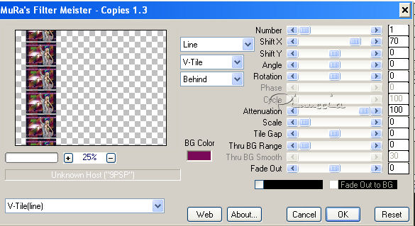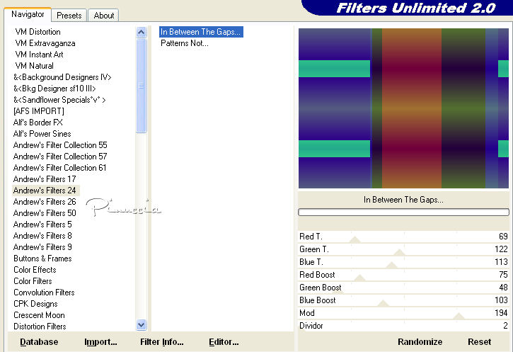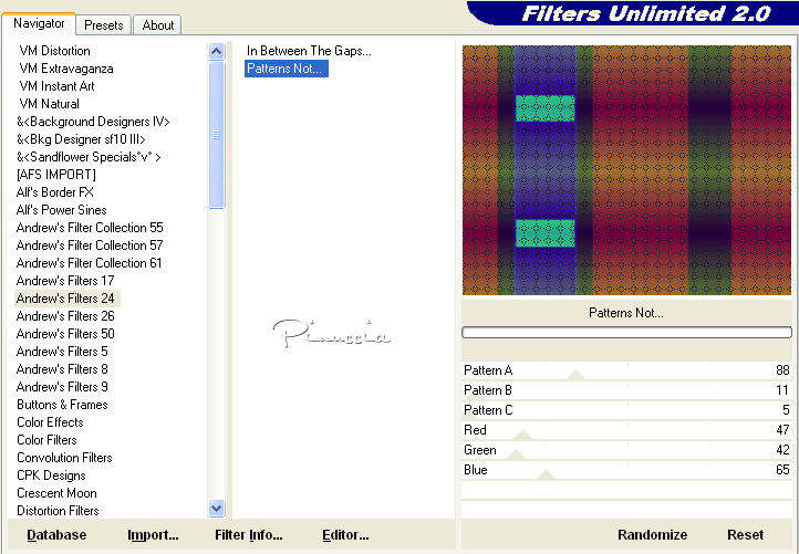 Effetti>Plugins>Filters Unlimited - Andrew's Filter collection 24 - In between the gaps, con i settaggi standard.