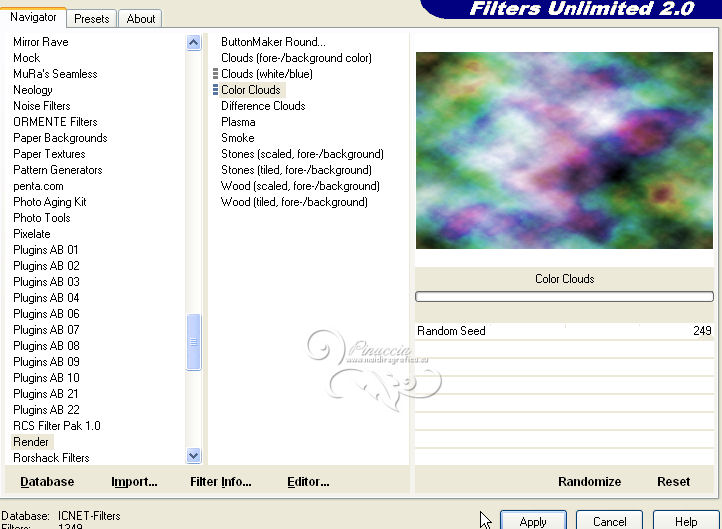 Effetti>Plugins>Filters Unlimited 2.0 - Render - Color Clouds, con i settaggi standard.