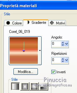 Passa il colore di primo piano a Gradiente, stile Lineare, e seleziona il gradiente Corel_06_019 con i seguenti settaggi.