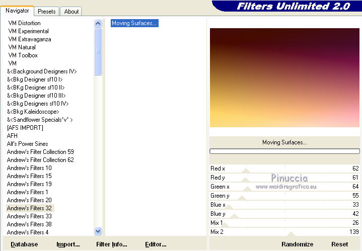 Effetti>Plugins>Filters Unlimited 2.0 - Andrew's Filters 32 - Moving surface con i settaggi standard.