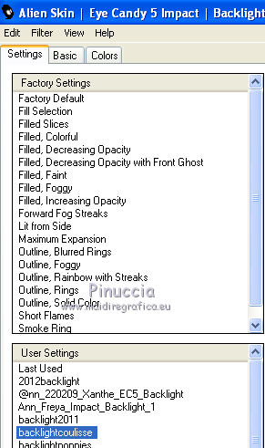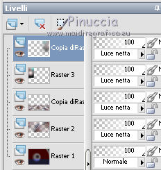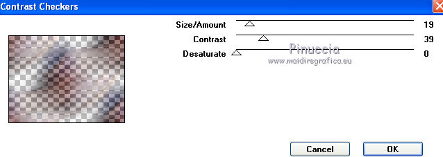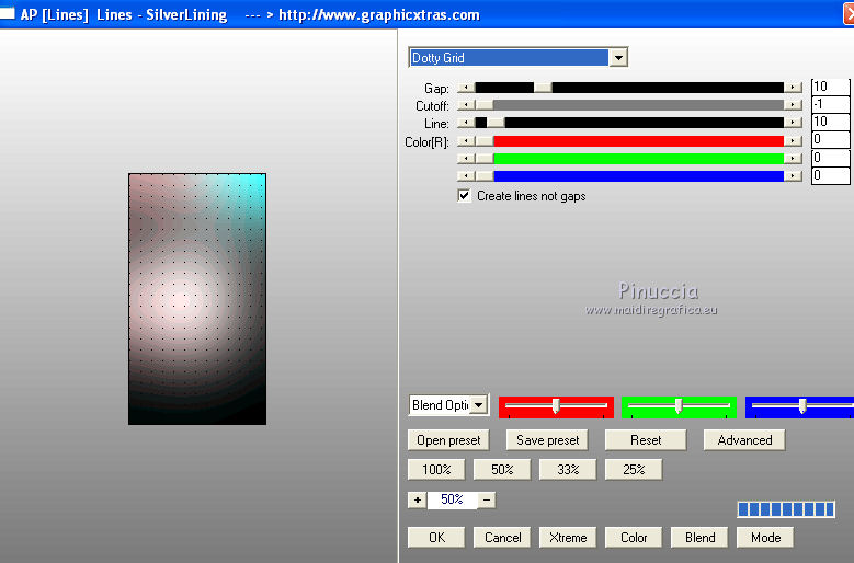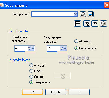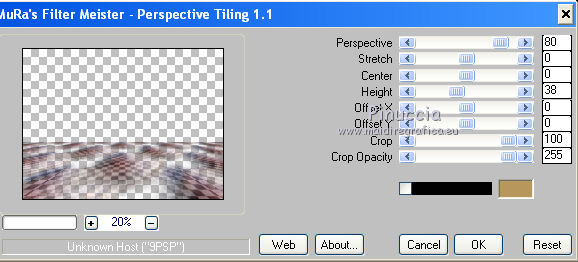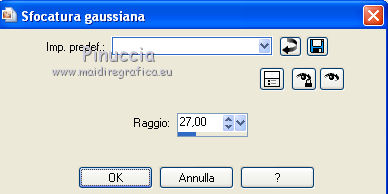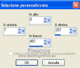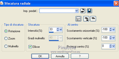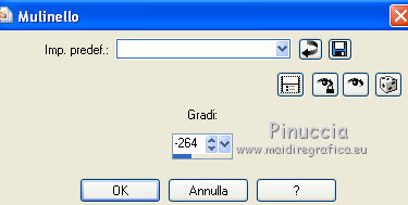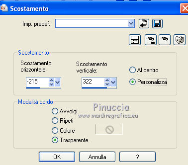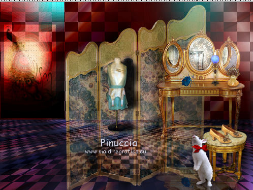 Occorrente: Materiale qui Il materiale fa parte della collezione personale di Roserika. Per favore, lascia intatto il copyright. Filtri: Se hai problemi con i filtri, ricordati della mia sezione filtri qui AP Lines qui Mura's Meister - Perspective Tiling qui Layout Tools qui Alien Skin Eye Candy 5 Impact qui Metti il preset backlightcoulisse nella cartella del filtro. Con un doppio clic sul file il preset sarà automaticamente installato nella cartella corretta. Metti il gradiente nella cartella Gradienti. Metti la selezione nella cartella Selezioni. 1. Apri una nuova immagine trasparente 1000 x 750 pixels. Passa il colore di primo piano a Gradiente e seleziona il gradiente ES Rosa 42, con i seguenti settaggi. ![]() Riempi l'immagine trasparente con il gradiente.Apri il tube femme1 e vai a Modifica>Copia. Torna al tuo lavoro e vai a Modifica>Incolla come nuovo livello. Regola>Sfocatura>Sfocatura radiale. ![]() Effetti>Effetti di immagine>Motivo unico. ![]() Effetti>Plugins>Layout Tools - Contrast Checkers. ![]() 2. Cambia la modalità di miscelatura di questo livello in Luce netta. Livelli>Duplica. Effetti>Plugins>Mura's Meister - Perspective Tiling. Clicca su Reset per ristabilire i settaggi standard, e cambia Height con 38. ![]() Attiva il livello sottostante. Attiva lo strumento Selezione ![]() Clicca sull'icona selezione personalizzata ![]() e imposta i seguenti settaggi. ![]() Premi sulla tastiera il tasto CANC. Attiva il livello inferiore. Regola>Tonalità e Saturazione>Viraggio. ![]() Selezione>Deseleziona. 3. Attiva il livello superiore. Selezione personalizzata ![]() ![]() Livelli>Nuovo livello raster. Riempi con il gradiente.Regola>Sfocatura>Sfocatura gaussiana - raggio 82. ![]() Regola>Colore>Correzione scolorimento. ![]() Effetti>Plugins>AP Lines - Lines SilverLining. ![]() Cambia la modalità di miscelatura di questo livello in Luce netta. 4. Livelli>Duplica. Immagine>Rifletti. Regola>Sfocatura>Sfocatura gaussiana - raggio 82. Questa dovrebbe essere la tua paletta dei livelli. ![]() Apri il tube "paravant". Attiva il livello Raster 2 e vai a Modifica>Copia. Torna al tuo lavoro e vai a Modifica>Incolla come nuovo livello. Spostalo in basso a destra.Livelli>Disponi>Sposta giù (sotto il livello con la sfocatura gaussiana). Attiva nuovamente il tube "paravant" e copia il livello Raster 1. Torna al tuo lavoro e vai a Modifica>Incolla come nuovo livello. Nella paletta dei livelli porta questo livello sopra il secondo livello dal basso (raster 2). Effetti>Effetti di immagine>Scostamento. ![]() Abbassa l'opacità di questo livello al 75%. 5. Livelli>Unisci>Unisci visibile. Regola>Messa a fuoco>Metti a fuoco. Apri l'immagine "paen" e vai a Modifica>Copia. Torna al tuo lavoro e vai a Modifica>Incolla come nuovo livello. Spostala in alto a sinistra,vedi l'esempio finale. Cambia la modalità di miscelatura di questo livello in Sovrapponi. 6. Apri il tube "objets". Copia e incolla sul tuo lavoro i tre livelli di cui è composto il tube, e disponi gli oggetti come nell'esempio.![]() Attiva nuovamente il tube femme1 e vai a Modifica>Copia. Torna al tuo lavoro e vai a Modifica>Incolla come nuovo livello. Spostalo in basso a sinistra, come nel mio esempio.Apri il tube "spot" e vai a Modifica>Copia. Torna al tuo lavoro e vai a Modifica>Incolla come nuovo livello. Effetti>Effetti di immagine>Scostamento. ![]() Livelli>Nuovo livello raster. Selezione>Carica/Salva selezione>Carica selezione da disco. Cerca e carica la selezione "coulisse". ![]() Riempi la selezione con il colore blu #00ffff.Effetti>Plugins>Alien Skin Eye Candy 5 Impact - Backlight. Seleziona il preset backlightcoulisse e ok. ![]() Selezione>Deseleziona. Regola>Sfocatura>Sfocatura gaussiana - raggio 27. ![]() Cambia la modalità di miscelatura di questo livello in Sovrapponi. 7. Livelli>Duplica. Effetti>Effetti di distorsione>Mulinello. ![]() Riporta la modalità di miscelatura di questo livello in Normale, e abbassa l'opacità al 91%. Livelli>Duplica. Immagine>Capovolgi. Regola>Tonalità e saturazione>Viraggio. ![]() Cambia la modalità di miscelatura di questo livello in Luce netta, e abbassa l'opacità al 56%. Attiva nuovamente il livello sottostante. Livelli>Duplica. Immagine>Rifletti. Effeteti>Effetti di immagine>Scostamento. ![]() Cambia la modalità di miscelatura di questo livello in Dissolvi, e abbassa l'opacità al 9%. Selezione>Carica/Salva selezione>Carica selezione da disco. Carica nuovamente la selezione "coulisse". ![]() Livelli>Nuovo livello raster. Riempi la selezione con il colore blu.Selezione>Deseleziona. 8. Immagine>Aggiungi bordatura, 20 pixels, simmetriche, con il colore nero. Firma il tuo lavoro ed esporta come jpg ottimizzata, compressione 20. ![]() ![]() Se hai problemi o dubbi, o trovi un link non funzionante, o anche soltanto per un saluto, scrivimi. |