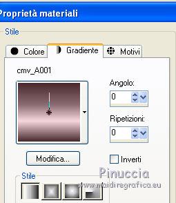 Passa il colore di primo piano a Gradiente e seleziona il gradiente cmv_A001 con i seguenti settaggi.