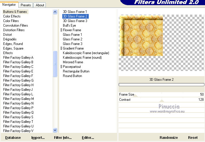 Effetti>Plugins>Filters Unlimited 2.0 - Buttons and Frames - 3D Glass Frame 2, con i settaggi standard.