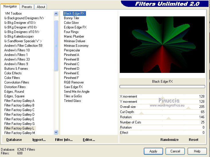Effetti>Plugins>Filters Unlimited - Factory Gallery L - Black Edge FX, con i settaggi standard.
