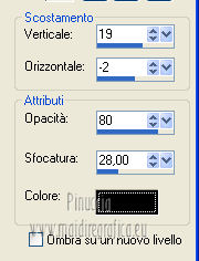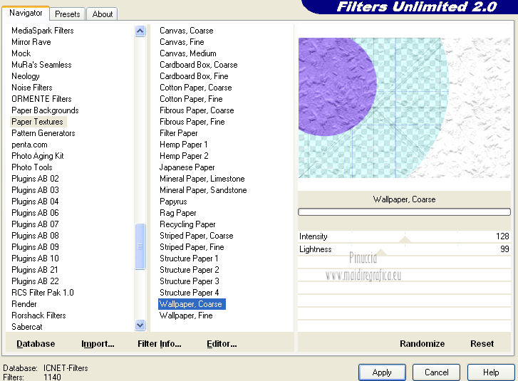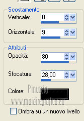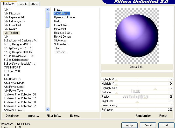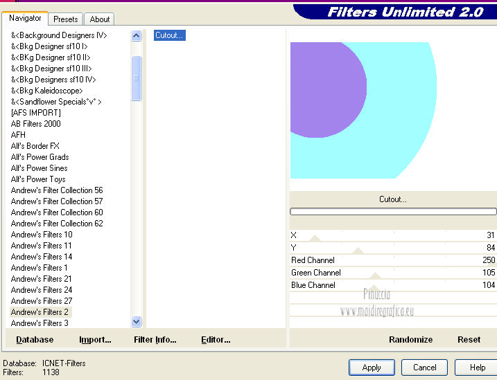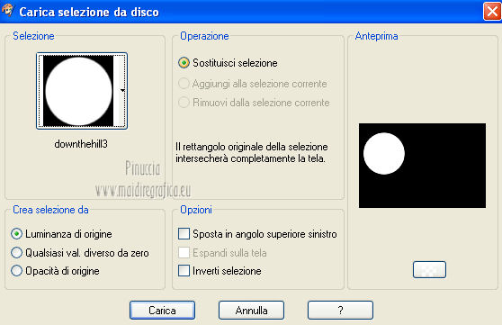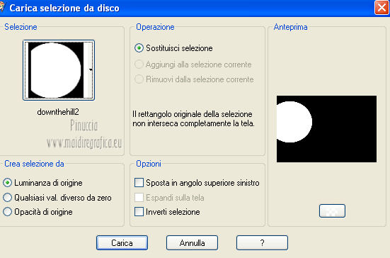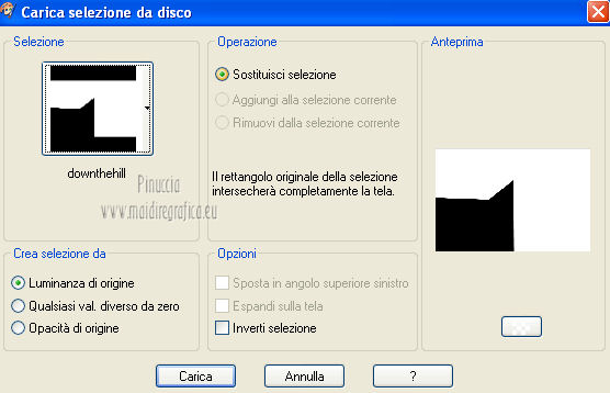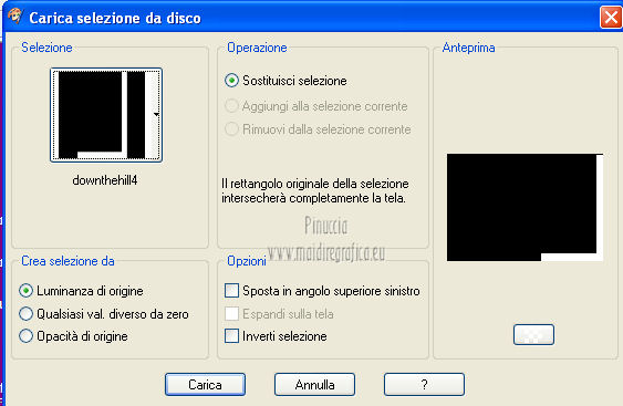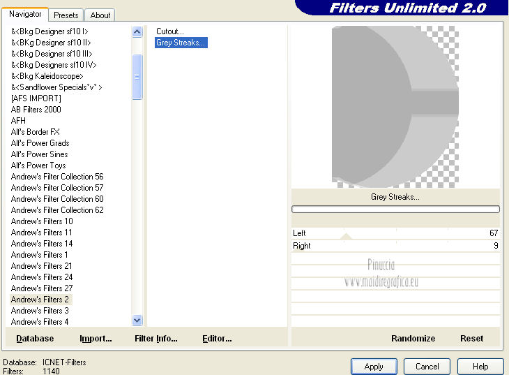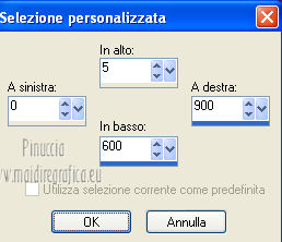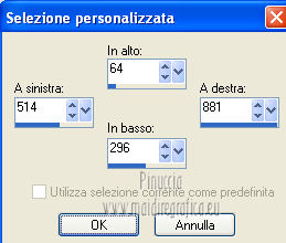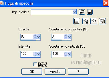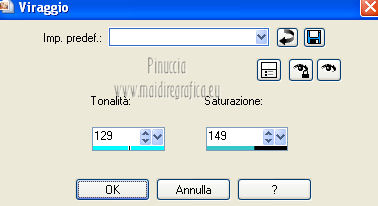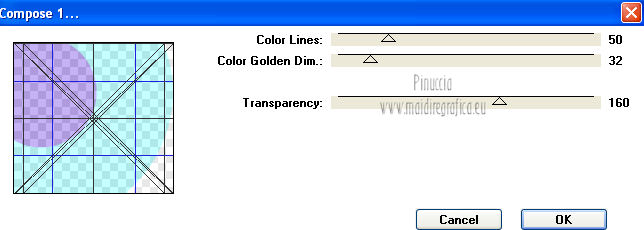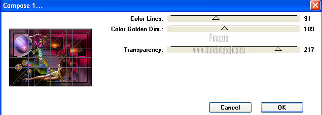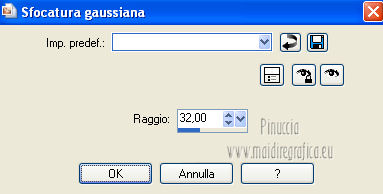 Occorrente: Materiale qui Il tube del paesaggio è di Suzie Sgai. Il tube della donna è di DeniseWorisch. Il resto del materiale fa parte della collezione personale di Roserika. Per favore, lascia intatto il copyright. Filtri: Se hai problemi con i filtri, ricordati della mia sezione filtri qui Filters Unlimited 2.0 qui VM Toolbox qui Andrew's Filters 2 qui Balder Olrik qui Simple qui Metti il gradiente ES Vintage 71 nella cartella Gradienti. Metti le selezioni nella cartella Selezioni. 1. Apri una nuova immagine trasparente 900 x 600 pixels. Passa il colore di primo piano a Gradiente, e seleziona il gradiente ES Vintage 71, con i seguenti settaggi. ![]() Imposta il colore di sfondo con #a384ed. Riempi l'immagine trasparente con il colore di sfondo.Effetti>Plugins>Filters Unlimited 2.0 - Andrew's Filter 2 - Cutout. ![]() Attiva lo strumento Bacchetta magica ![]() e clicca sulla parte bianca per selezionarla. ![]() Livelli>Nuovo livello raster. Riempi con il gradiente.Selezione>Deseleziona. Effetti>Effetti di riflesso>Fuga. ![]() Chiudi questo livello per il momento. 2. Attiva il livello sottostante. Attiva nuovamente lo strumento Bacchetta magica ![]() e clicca sulla parte celeste per selezionarla. Effetti>Plugins>Balder Olrik - Compose 1. ![]() Selezione>Deseleziona. Seleziona la parte viola con la bacchetta magica ![]() ![]() Selezione>Innalza selezione a livello. Effetti>Plugins>Filters Unlimited 2.0 - VM Toolbox - Crystal ball. ![]() Attiva nuovamente il livello sottostante. Selezione>Innalza selezione a livello. Effetti>Plugins>Filters Unlimited 2.0 - Andrew's Filter 2 - Grey Streaks. ![]() Selezione>Deseleziona. 3. Livelli>Disponi>Porta in alto. Cambia la modalità di miscelatura di questo livello in Luce netta. Attiva il livello inferiore, e cambia la modalità di miscelatura di questo livello in Sovrapponi (per il momento non vedrai il risultato del cambio di miscelatura). Effetti>Plugins>Filters Unlimited 2.0 - Paper Texture - Wall paper Coarse, con i settaggi standard. ![]() Livelli>Nuovo livello raster. Livelli>Disponi>Porta sotto. Cambia i settaggi del gradiente in stile Radiale. ![]() Regola>Sfocatura>Sfocatura radiale - raggio 32. ![]() Effetti>Plugins>Simple - Pizza slice mirror. 4. Livelli>Duplica. Effetti>Effetti di immagine>Scostamento. ![]() Selezione>Carica/Salva selezione>Carica selezione da disco. Cerca e carica la selezione downthehill. ![]() Premi sulla tastiera il tasto CANC. Selezione>Deseleziona. Cambia la modalità di miscelatura di questo livello in Differenza. Rimani su questo livello. Selezione>Carica/Salva selezione>Carica selezione da disco. Cerca e carica la selezione downthehill2. ![]() Premi sulla tastiera il tasto CANC. Selezione>Deseleziona. Livelli>Duplica. Immagine>Rifletti. Regola>Sfocatura>Sfocatura gaussiana - raggio 20. ![]() Cambia la modalità di miscelatura di questo livello in Filtra. Regola>Tonalità e saturazione>Viraggio. ![]() 5. Riapri e attiva il livello superiore. Cambia la modalità di miscelatura di questo livello in Luminanza. Effetti>Effetti di bordo>Aumenta. Livelli>Unisci>Unisci visibile. Attiva lo strumento Selezione ,clicca sull'icona Selezione personalizzata ![]() e imposta i seguenti settaggi: ![]() Selezione>Innalza selezione a livello. Selezione>Modifica>Contrai - 12 pixels. Premi sulla tastiera il tasto CANC. Selezione>Deseleziona. Effetti>Effetti 3D>Smusso a incasso. ![]() 6. Chiudi il livello inferiore, e attiva il livello superiore. Seleziona con la bacchetta magica l'interno della cornice.Livelli>Nuovo livello raster. Apri il tube SS_170 e vai a Modifica>Copia. Torna al tuo lavoro e vai a Modifica>Incolla nella selezione. Selezione>Deseleziona. Livelli>Disponi>Sposta giù. Attiva nuovamente il livello superiore. Effetti>Effetti 3D>Sfalsa ombra, con il colore nero. ![]() Selezione>Carica/Salva selezione>Carica selezione da disco. Cerca e carica la selezione downthehill3. ![]() Livelli>Nuovo livello raster. Modifica>Incolla nella selezione (il tube SS_170 è ancora in memoria). Selezione>Deseleziona. Cambia la modalità di miscelatura di questo livello in Sovrapponi, e abbassa l'opacità all'86%. Riapri il livello inferiore. 7. Livelli>Unisci>Unisci visibile. Selezione personalizzata ![]() ![]() Immagine>Ritaglia la selezione. Livelli>Duplica. Immagine>Ridimensiona, al 70%, tutti i livelli non selezionato. Effetti>Effetti di immagine>Scostamento. ![]() Livelli>Duplica. Immagine>Ridimensiona, al 90%, tutti i livelli non selezionato. Livelli>Disponi>Sposta giù. Effetti>Effetti di immagine>Scostamento. ![]() Livelli>Duplica. Livelli>Disponi>Sposta giù. Effetti>Effetti d immagine>Scostamento. ![]() Effetti>Effetti 3D>Sfalsa ombra, con il colore nero. ![]() 8. Apri il tube pspcybertubes-sentada1-2010-002 e copia il livello Raster 1. Torna al tuo lavoro e vai a Modifica>Incolla come nuovo livello. Spostalo in basso al centro,come nel mio esempio. Apri il tube decorsfleurs e vai a Modifica>Copia. Torna al tuo lavoro e vai a Modifica>Incolla come nuovo livello. Spostalo in basso a sinistra, come nel mio esempio.Livelli>Duplica. Immagine>Ridimensiona, al 60%, tutti i livelli non selezionato. Sposta questo tube un po' più in alto e a destra.Cambia la modalità di miscelatura di questo livello in Luce netta. Apri il tube décors noeud e vai a Modifica>Copia. Torna al tuo lavoro e vai a Modifica>Incolla come nuovo livello. Spostalo in alto a sinistra.![]() 8. Immagine>Aggiungi bordatura, 10 pixels, simmetriche, con il colore nero. Regola>Messa a fuoco>Metti a fuoco. Modifica>Copia. Immagine>Aggiungi bordatura, 40 pixels, simmetriche, con un colore contrastante. Seleziona questo bordo con la bacchetta magica ![]() Modifica>Incolla nella selezione. Regola>Sfocatura>Sfocatura gaussiana - raggio 20. ![]() Effetti>Plugins>Balder Olrik. ![]() Selezione>Innalza selezione a livello. Selezione>Deseleziona. Livelli>Duplica. Immagine>Ruota per gradi - 90 gradi a sinistra. ![]() Immagine>Ridimensiona, al 75%, tutti i livelli non seleziona