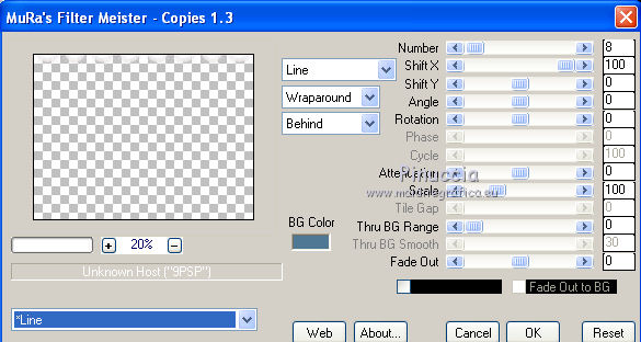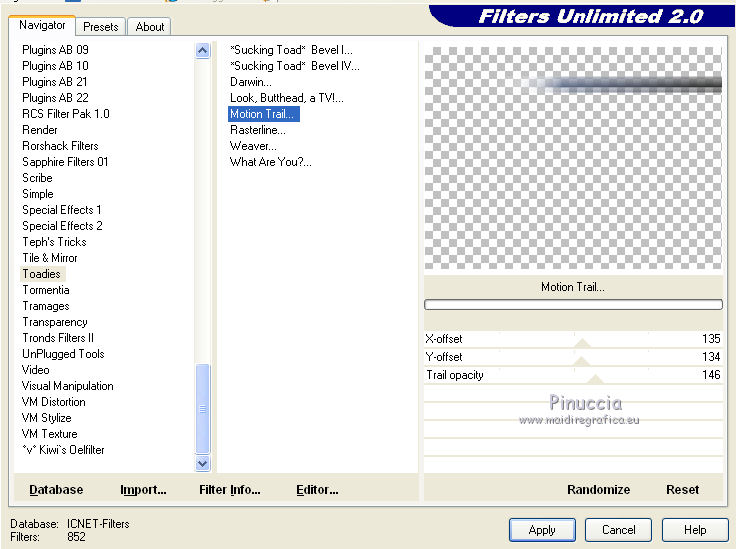 Effetti>Plugins>Filters Unlimited - Toadies - Motion Trail, con i settaggi standard.
