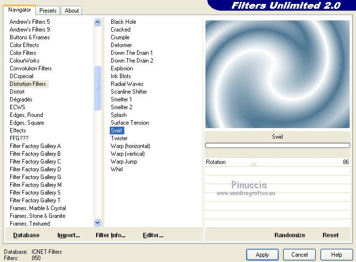 Effetti>Plugins>Filters Unlimited 2.0 - Distortion filters - Swirl, con i settaggi standard.