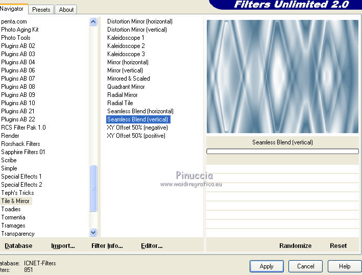 2. Effetti>Plugins>Filters Unlimited 2.0 - Tile and Mirror - Seamless blend (vertical).