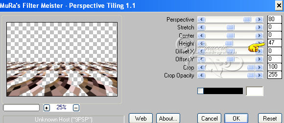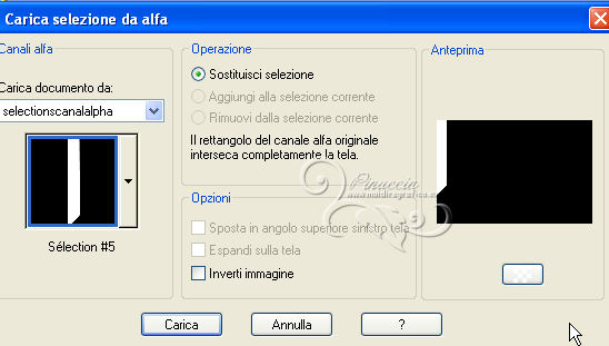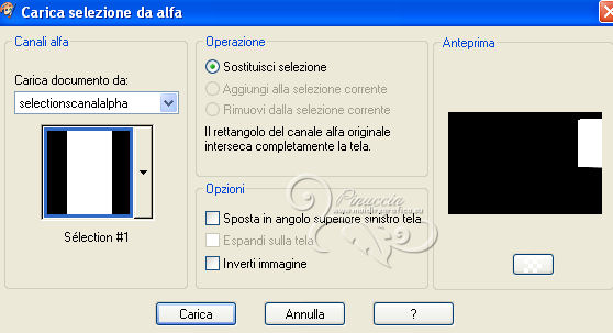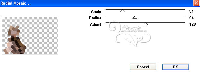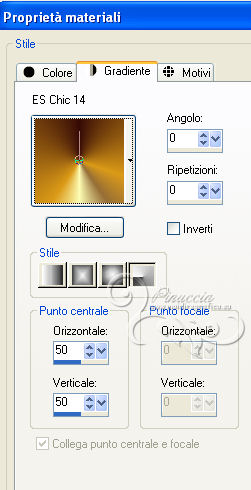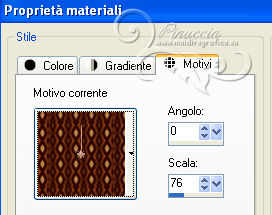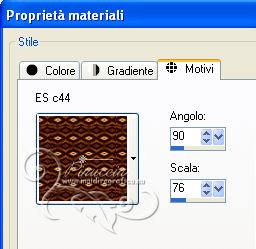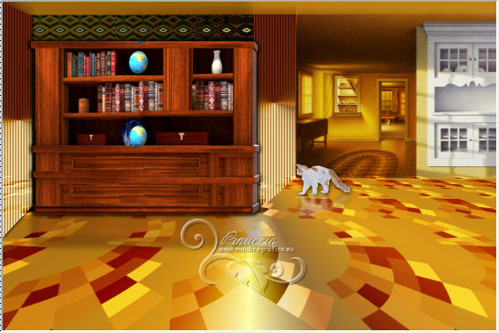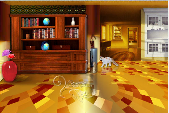 Occorrente: Materiale qui Filtri: Se hai problemi con i filtri, ricordati della mia sezione filtri qui VM Toolbox qui Mura's Meister - Perspective Tiling qui Metti il gradiente nella cartella Gradiente. Apri tutto il materiale in PSP e minimizzalo. 1. Apri selectionscanalalpha. L'immagine, che ha le dimensioni 900 x 600 pixels, non è vuota ma contiene le selezioni salvate sul canale alfa, e sarà la base del tuo lavoro. Imposta il colore di primo piano con il gradiente ES Chic 14. ![]() Riempi l'immagine trasparente con il gradiente.Apri il tube eida, e vai a Modifica>Copia. non chiuderlo perchè ti servirà ancora Torna al tuo lavoro e vai a Modifica>Incolla come nuovo livello. Effetti>Effetti di immagine>Scostamento. ![]() Effetti>Plugins>VM Toolbox - Radial Mosaic, con i settaggi standard. ![]() 2. Immagine>Rifletti. Effetti>Plugins>Mura's Meister - Perspective Tiling. ![]() Cambia la modalità di miscelatura di questo livello in Sovrapponi. Attiva il livello inferiore. Selezione>Carica/Salva selezione>Carica selezione da canale alfa. La selezione selection#1 è subito disponibile. Devi soltanto cliccare Carica. ![]() Premi sulla tastiera il tasto CANC ![]() Selezione>Deseleziona. ti sembrerà strano, ma non preoccuparti. Questo serve per eliminare il colore sotto il tube che aggiungerai al prossimo passaggio 3. Livelli>Nuovo livello raster. Selezione>Carica/Salva selezione>Carica selezione da canale alfa. Apri il menu delle selezioni e carica Selection#2. ![]() Apri l'immagine interieurcuisine e vai a Modifica>Copia. Torna al tuo lavoro e vai a Modifica>Incolla nella selezione. Selezione>Deseleziona. Cambia la modalità di miscelatura di questo livello in Luce netta. ecco cosa avresti avuto se non avessi tagliato la selezione al punto precedente. ![]() Livelli>Nuovo livello raster. Selezione>Carica/Salva selezione>Carica selezione da canale alfa. Apri il menu delle selezioni e carica Selection#3. ![]() Riempi la selezione con il gradiente.Effetti>Effetti di trama>Veneziana - colore #923911. ![]() Selezione>Deseleziona. Passa il colore di sfondo a Motivi, e nella categoria Immagini aperte cerca e seleziona il motivo ESc44, con i seguenti settaggi. ![]() Livelli>Nuovo livello raster. Selezione>Carica/Salva selezione>Carica selezione da canale alfa. Apri il menu delle selezioni e carica Selection#4. ![]() Riempi la selezione con il motivo.Selezione>Deseleziona. Cambia la modalità di miscelatura di questo livello in Differenza. 4. Livelli>Nuovo livello raster. Selezione>Carica/Salva selezione>Carica selezione da canale alfa. Apri il menu delle selezioni e carica Selection#5. ![]() Riempi la selezione con il gradiente.Effetti>Effetti di trama>Veneziana, con i settaggi precedenti. Selezione>Deseleziona. Effetti>Effetti 3D>Sfalsa ombra, con il colore nero. ![]() Livelli>Nuovo livello raster. Selezione>Carica/Salva selezione>Carica selezione da canale alfa. Apri il menu delle selezioni e carica Selection#6. ![]() Riempi la selezione con il gradiente.Regola>Sfocatura>Sfocatura gaussiana - raggio 10. ![]() Selezione>Deseleziona. Livelli>Unisci>Unisci visibile. Apri il tube chat, e vai a Modifica>Copia. Torna al tuo lavoro e vai a Modifica>Incolla come nuovo livello. Spostalo sullo sfondo della cucina.Vedi il mio esempio. Apri il tube meuble e vai a Modifica>Copia. Torna al tuo lavoro e vai a Modifica>Incolla come nuovo livello. Spostalo a sinistra, come nel mio esempio.![]() 5. Apri il tube objets. Copia e incolla sul tuo lavoro entrambi i livelli di cui è composto il tube, e posiziona oggetti come nell'esempio.![]() Apri il tube canapé e vai a Modifica>Copia. Torna al tuo lavoro e vai a Modifica>Incolla come nuovo livello. Spostalo in basso a destra.Attiva nuovamente il tube eida e vai a Modifica>Copia. Torna al tuo lavoro e vai a Modifica>Incolla come nuovo livello. Immagine>Ridimensiona, all'85%, tutti i livelli non selezionato. Spostalo in basso al centro,come nel mo esempio. Effetti>Effetti 3D>Sfalsa ombra, con il colore nero. ![]() Immagine>Aggiungi bordatura, 10 pixels, simmetriche, con il colore nero. Immagine>Aggiungi bordatura, 20 pixels, simmetriche, con un colore contrastante. Seleziona questo bordo con la bacchetta magica ![]() Cambia i settaggi del motivo ![]() Riempi la selezione con il motivo.Selezione>Deseleziona. Firma il tuo lavoro e salva in formato jpg. ![]() Se hai problemi o dubbi, o trovi un link non funzionante, o anche soltanto per un saluto, scrivimi. |