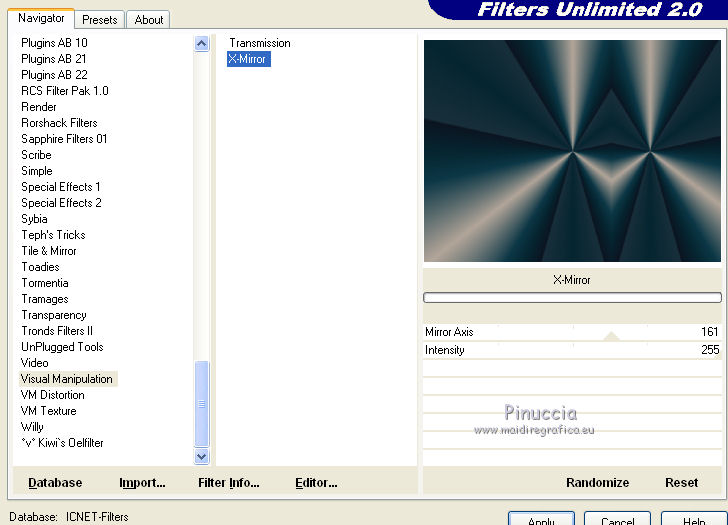 Effetti>Plugins>Filters Unlimited 2.0 - Visual Manipulations - X-Mirror, con i settaggi standard.