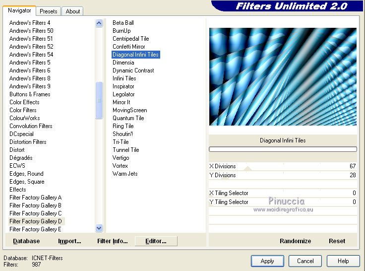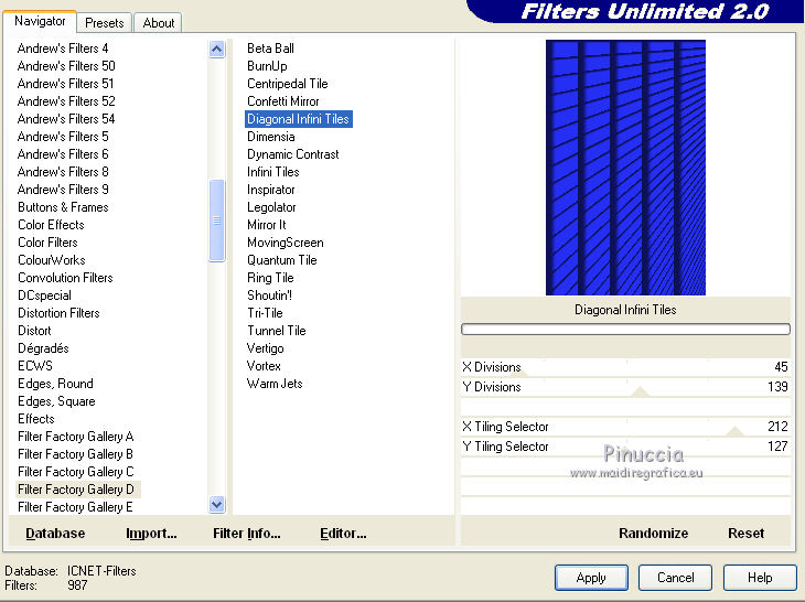 Effetti>Plugins>Filters Unlimited - Filters Factory Gallery D - Diagonal Infini Tiles, con i settaggi standard.
